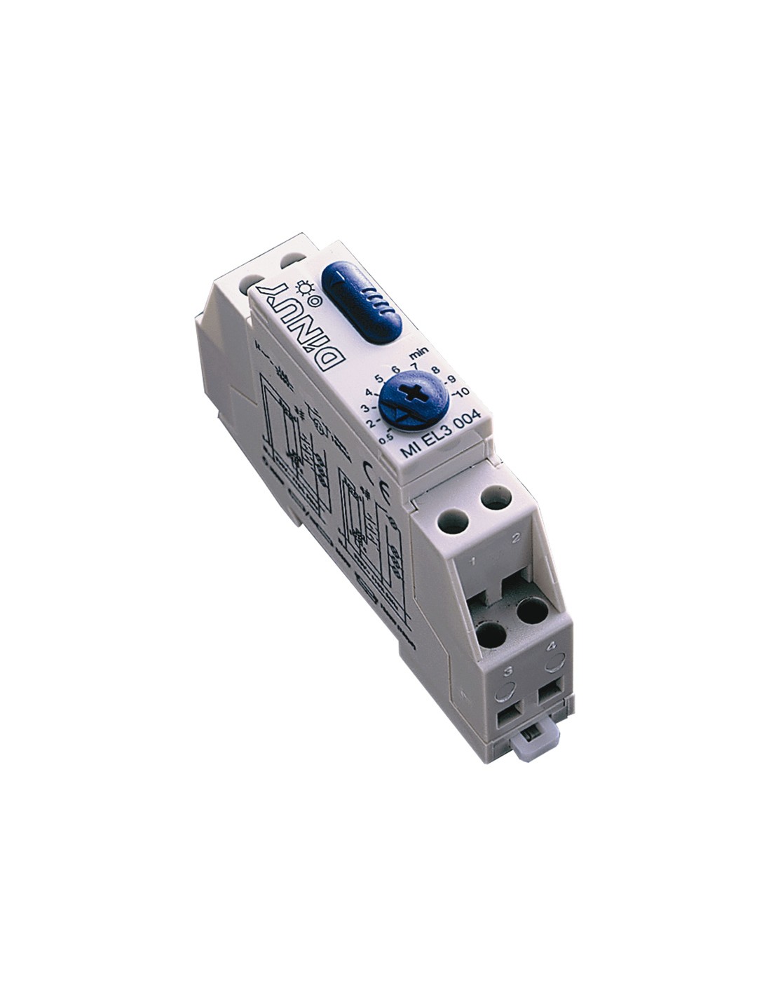 Programador minutero DINUY. Electrónico modular (escalera). Poder de corte 16 A.-250 V. Incandescencia máxima 3.000 W. Regulación entre 30 segundos y 10 minutos. Mando manual para encendido permanente. 16 A.-250 V.