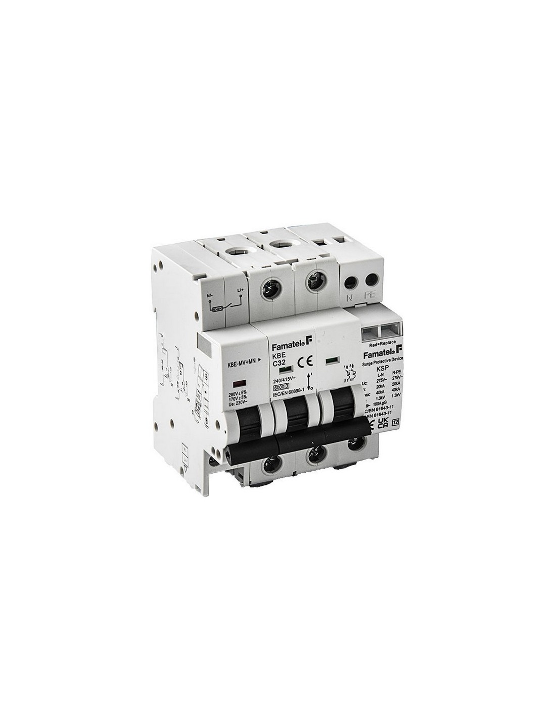 Interruptor IGA combinado FAMATEL El componente eléctrico IGA con protección combinada contra sobretensiones es un interruptor general automático de 2 polos (2P) que protege los circuitos de sobretensiones permanentes y transitorias. 2P 40A.
