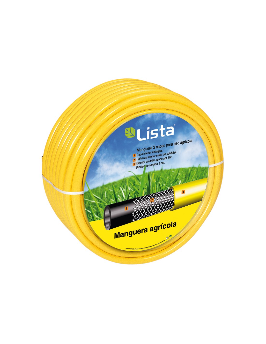 Manguera riego LISTA. Agrícola, tricapa con trama interior de poliéster. Color amarillo exterior y negro interior. Presión servicio 8 bares. ø 25 mm. x 50 m.