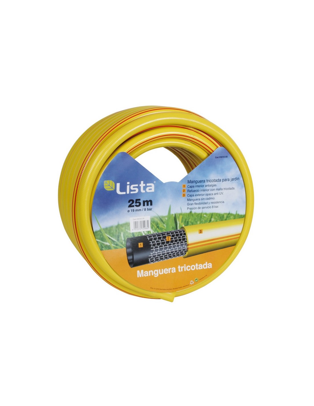 Manguera riego tricotada LISTA Tricotada 3 capas. Atóxica. Antialgas. Presión de servicio 8 bares. ø 15 mm. x 25 m.