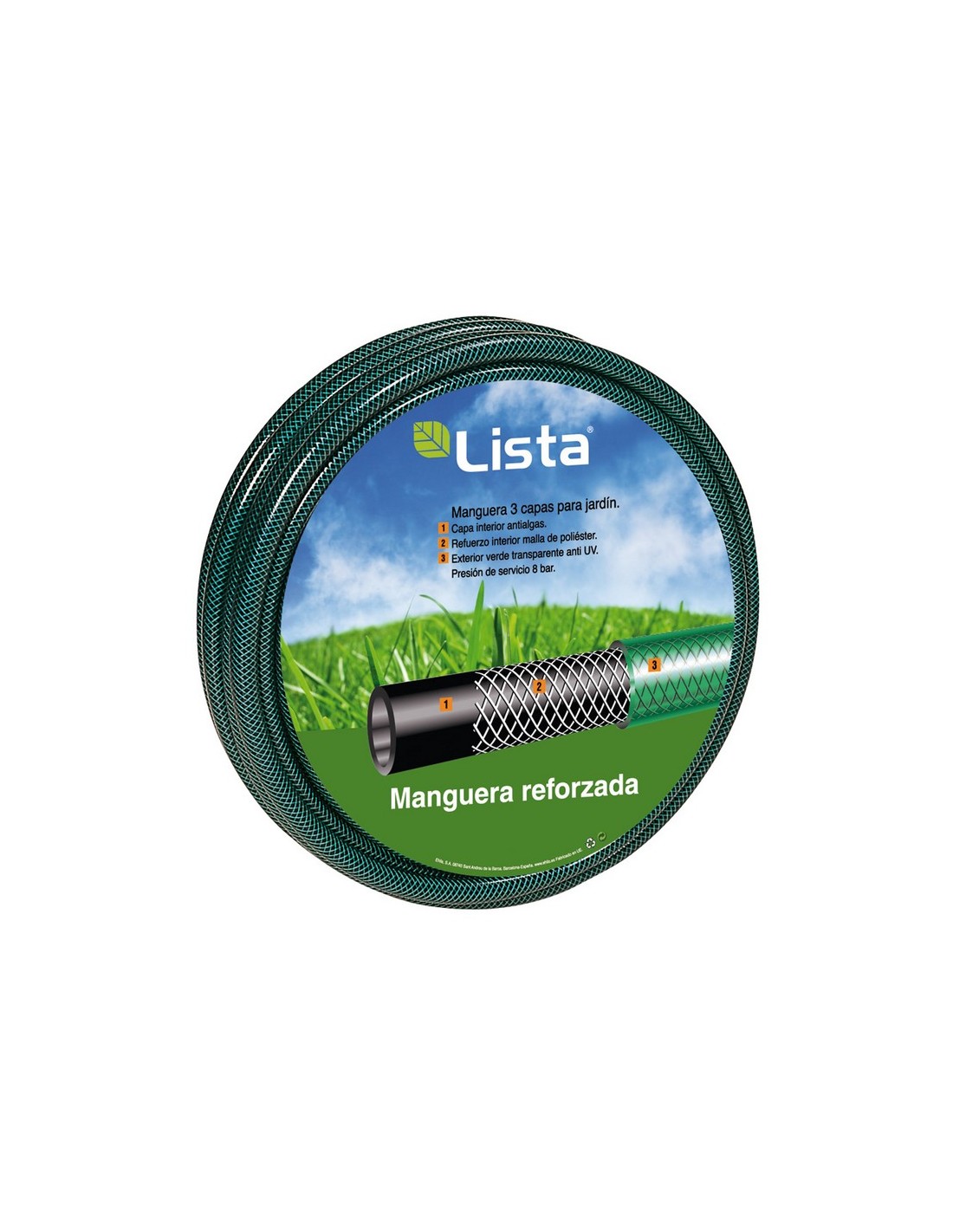 Manguera riego trenzada LISTA Reforzada tricapa, trama interior de poliéster. Color verde interior y transparente exterior. Presión servicio 8 bares. ø 15 mm. x 15 m.