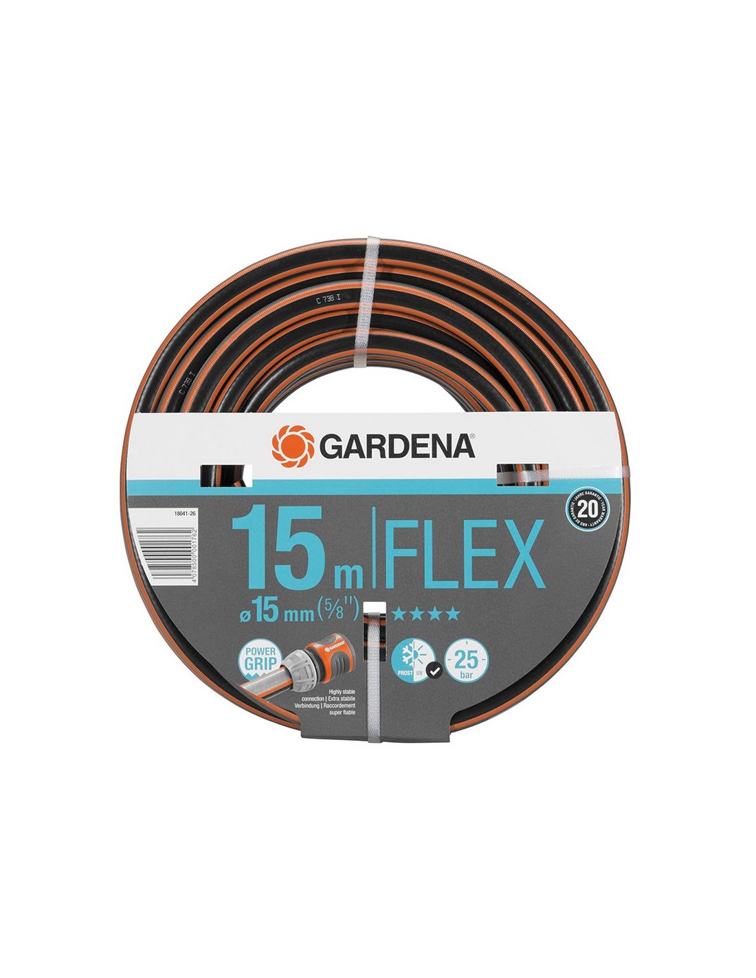 Manguera FLEX ø15-15m Conexión perfecta de la manguera al conector rápido. Alta resistencia a la presión (hasta 25 bares) e indeformable gracias al refuerzo de carbono de alta calidad. Rollo de 15 m.