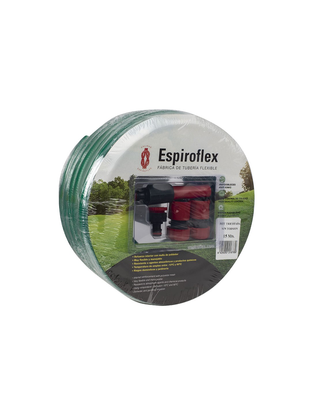 Manguera tricotada sin torsión ESPIROFLEX con acesorios No se retuerce ni se estrangla. Incluye racord hembra, 2 conectores y lanza de riego. ø 15 mm x 15 m.