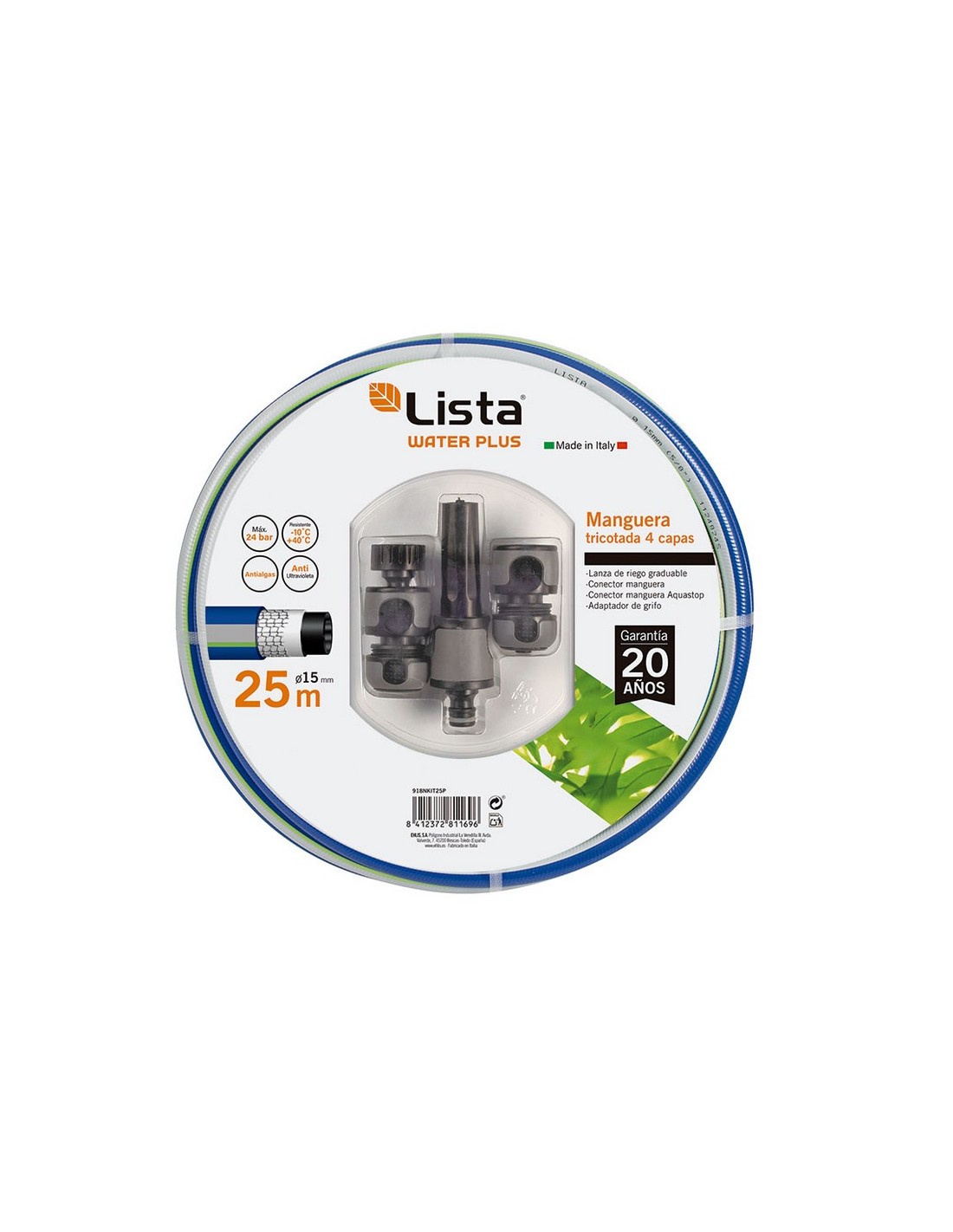 Manguera riego tricotada con accesorios LISTA Plus Conjunto 4 conexiones: lanza, conector manguera aquastop, conector manguera y adpatador de grifo. Manguera Tricotada 4 capas. Dos capas interiores negras, una tricotada y la capa exterior acabado mate azul con una banda gris y una franja verde. Anti-algas. Anti-ultravioleta. Flexible. 20 años de garantía. ø 15 mm. 25 m.