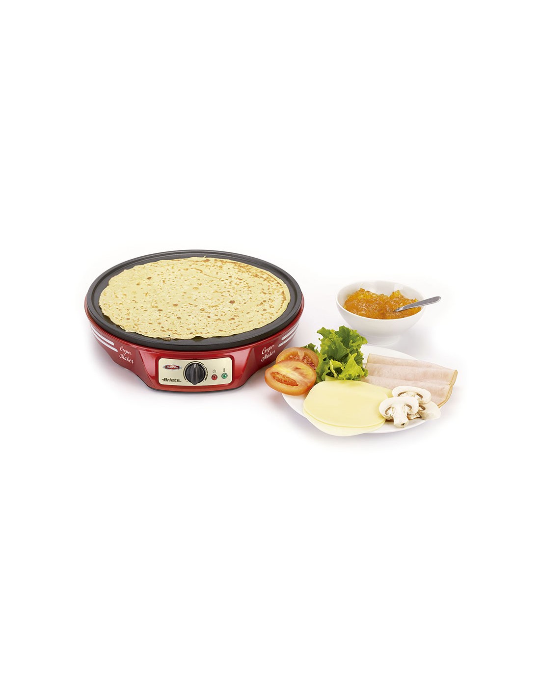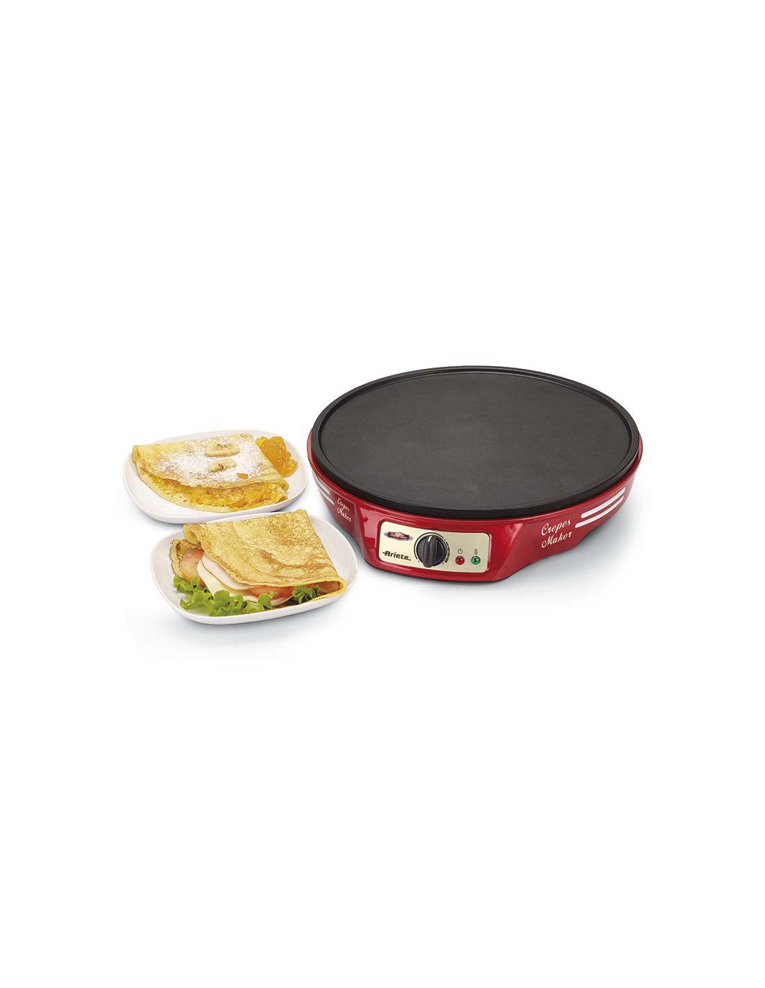 Crepera ARIETE Party Time 183 Prepara tortitas, crepes y pancakes. Termostato regulable y luz indicadora de temperatura elegida. Incluye 2 espátulas de madera. 1.000 W.