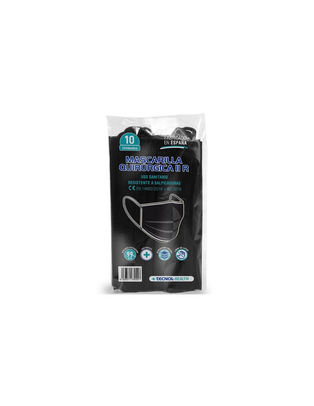 Mascarilla quirúrgica Tipo II TQM09 Protección respiratoria y uso preventivo para la transmisión de virus y bacterias. Triple capa de tejido sin tejer y material hipoalergénico.Tira nasal metálica moldeable y cintas de polipropileno para máximo confort. Uso sanitario. EN 14863:2019+AC:2019, ISO 22609:2004, EN ISO 11737-1:2018. Fabricación y certificación nacional. Color negro. 10 unid.