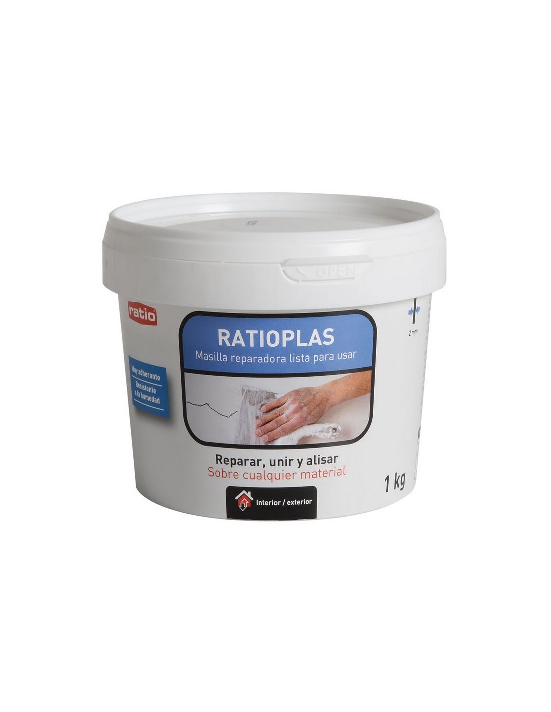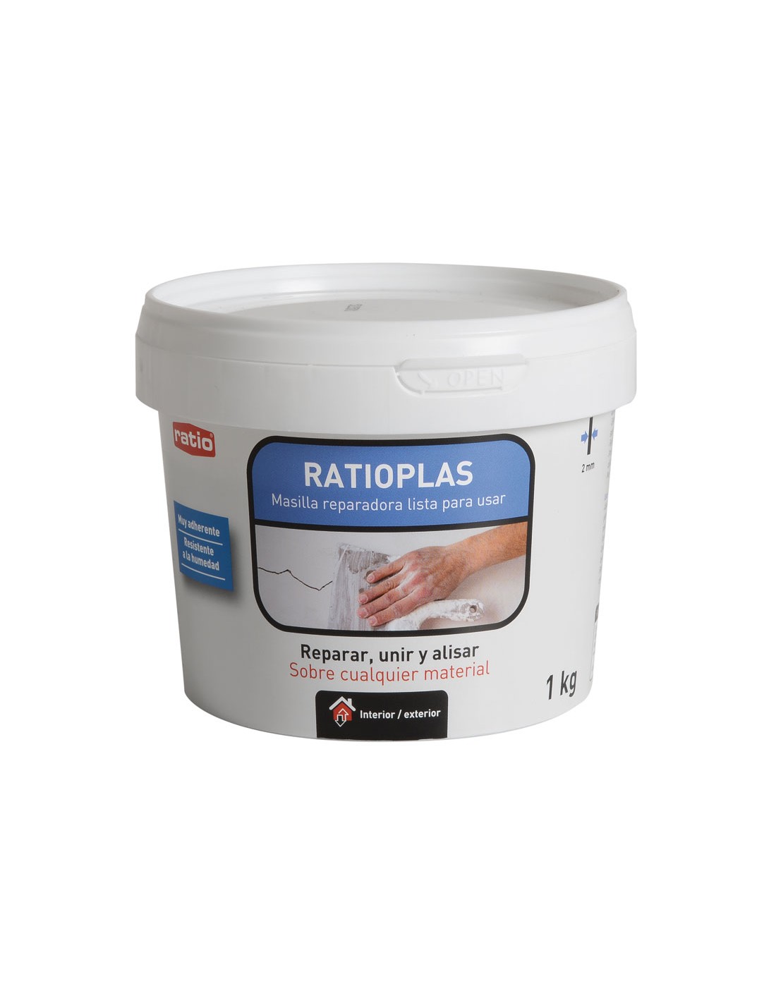 Masilla reparadora en pasta RATIOPLAS Reparar, unir y alisar sobre superficies porosas y no porosas. Adherencia extraordinaria sobre todo tipo de soportes. Resistente a la humedad. Uso interior/exterior. Bote 1 kg.