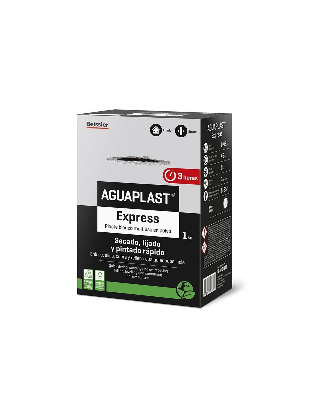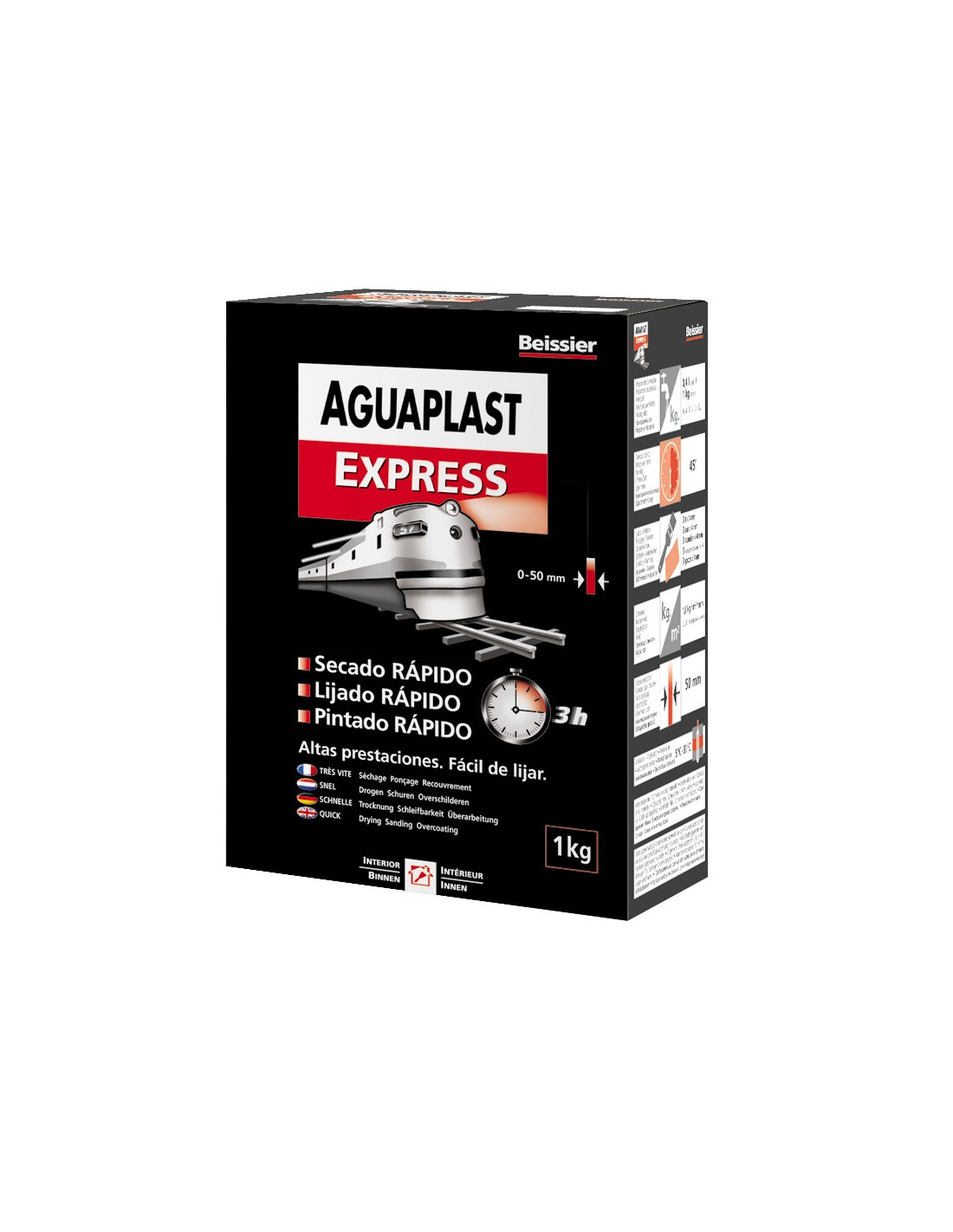 Masilla AGUAPLAST Express Plaste en polvo polivalente de interior de secado rápido (3 horas). Se puede utilizar sobre cualquier material, incluso vidrio, metales y en cualquier espesor de capa. Lijado fácil. Solución segura para cualquier problema. 1 kg.