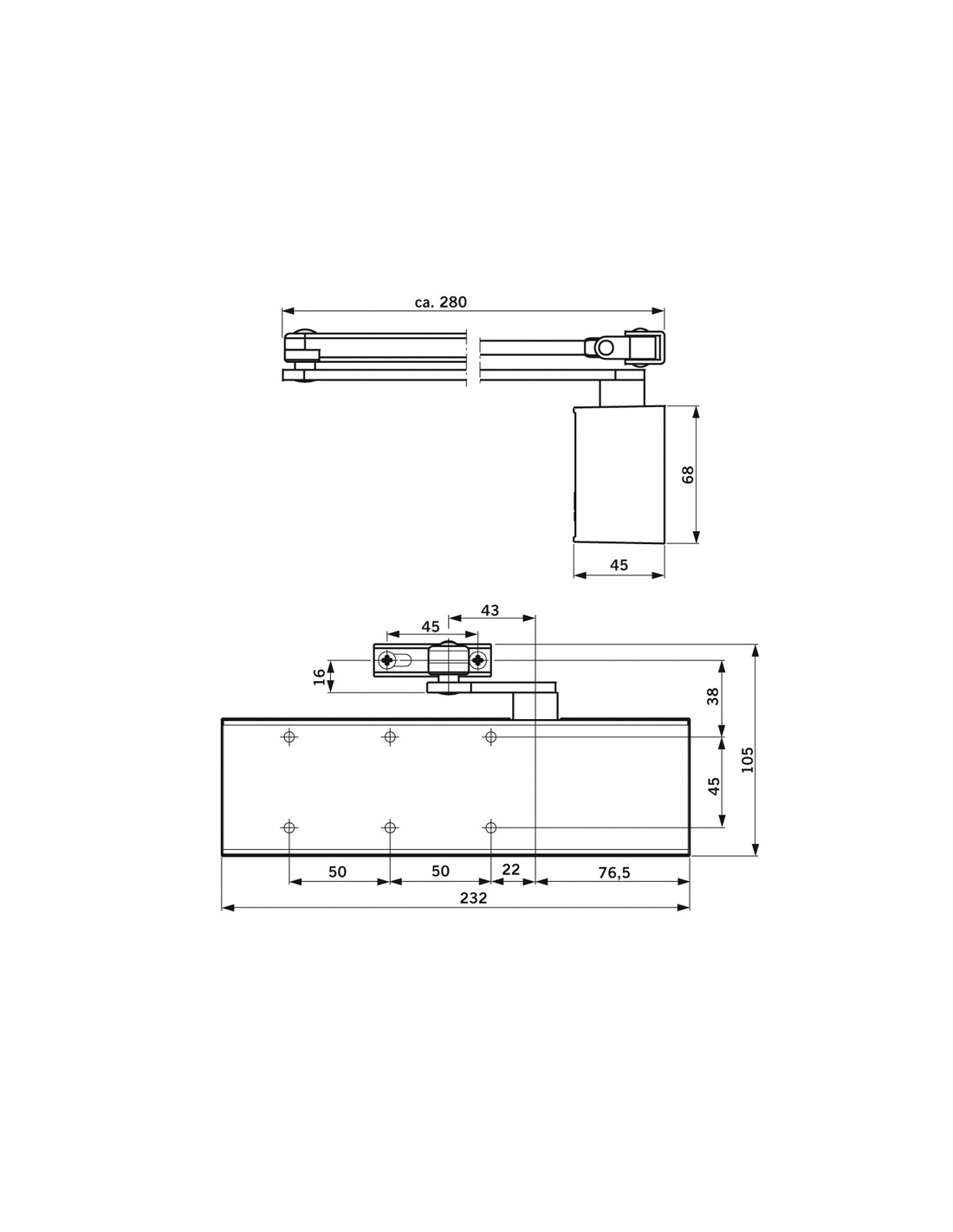 Cierrapuertas DORCAS TS-71. Mecanismo piñon-cremallera con brazo. Fuerza regulable EN 3-4. Anchura puertas hasta 110 cm. Puertas hasta 100 kg. Con retenedor. Negro.