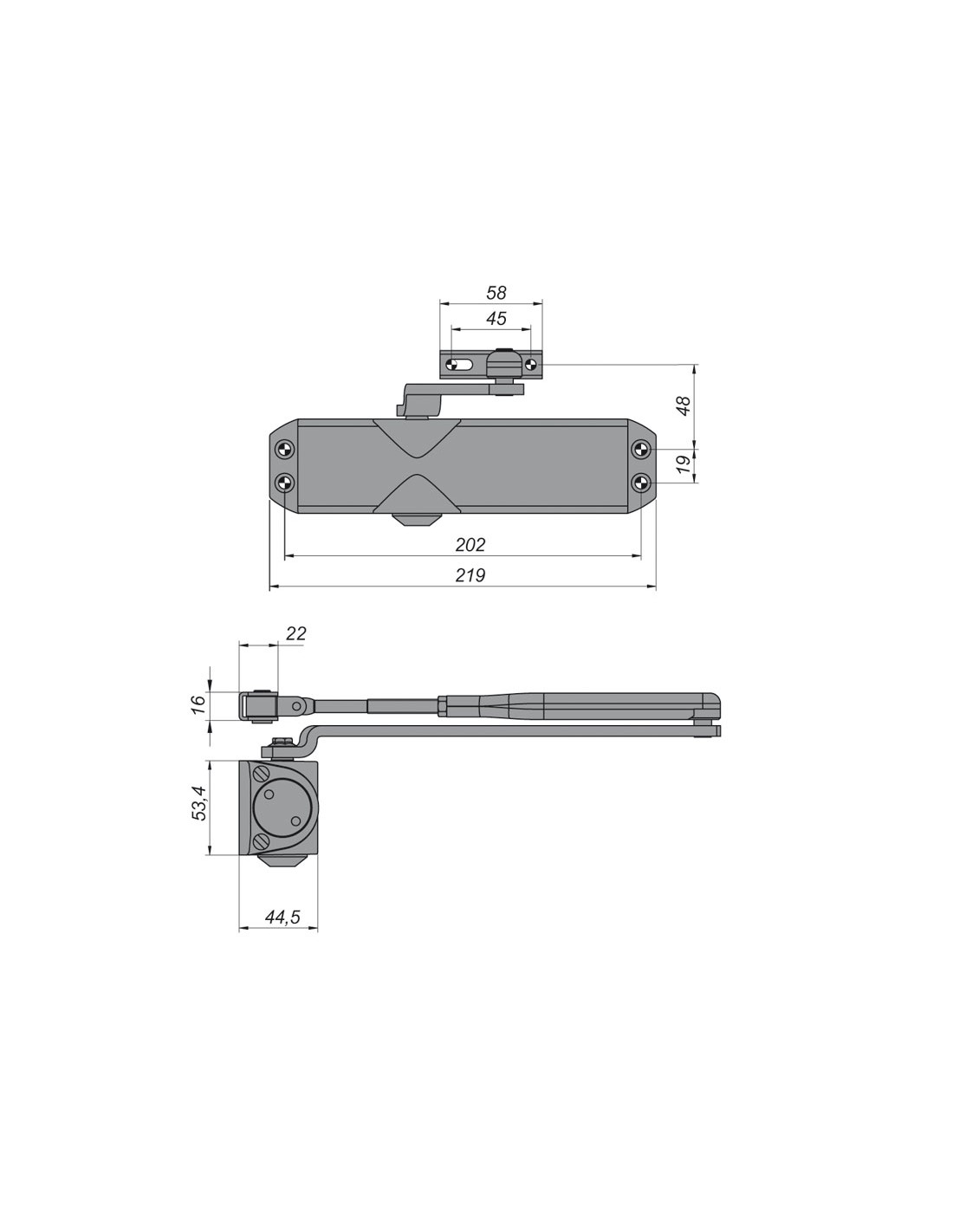 Cierrapuertas hidráulico TELESCO Delta 1800. Mecanismo piñón-cremallera. Cuerpo en aluminio, brazo y componentes internos de acero. Anchura puertas hasta 110 cm y 80 kg de peso. Fuerza EN 2-3-4. Homologado contra el fuego RF 120 min. Norma EN1154. Sin retenedor. Plata.