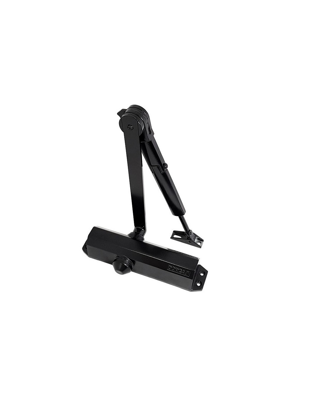 Cierrapuertas hidráulico DORCAS DC2 Mecanismo piñón-cremallera. Fuerza EN 2-4. Puertas de 25 a 85 kg. Anchura puertas de 85 a 110 cm. Certificación fuego EN-1634. Con retenedor. Negro.