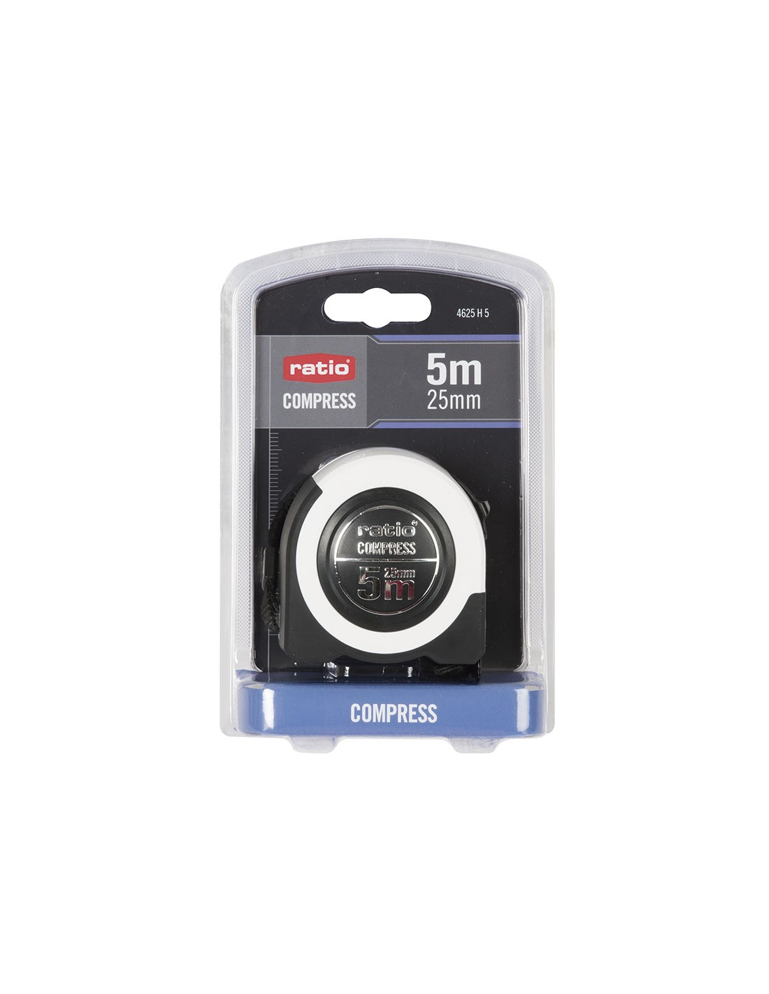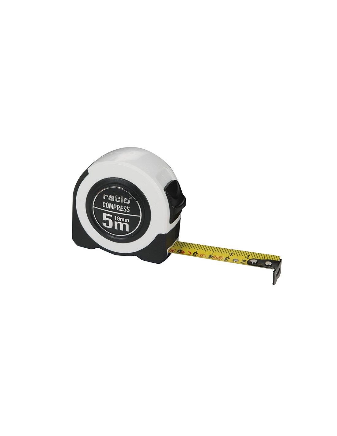 Flexómetro RATIO compress Carcasa ABS, con recubrimiento antideslizante. Cinta numeración doble cara (amarilla/blanca) con revestimiento nilón antireflex. Gancho reforzado. Clip para cinturón y botón de bloqueo. Homologado CE. Clase de Precisión II. 5 metros. Cinta 19 mm.