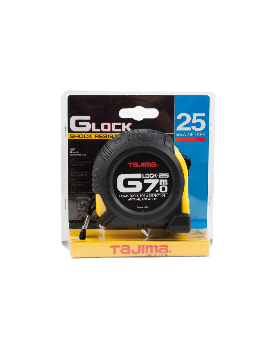 Flexómetro TAJIMA G-Lock Caja plástico ABS. Cinta acero esmaltado amarillo. Recubrimiento goma antideslizante. Clip sujeción y botón de bloqueo. . Homologado CE. Clase de precisión II. 7 m. Cinta 25 mm.