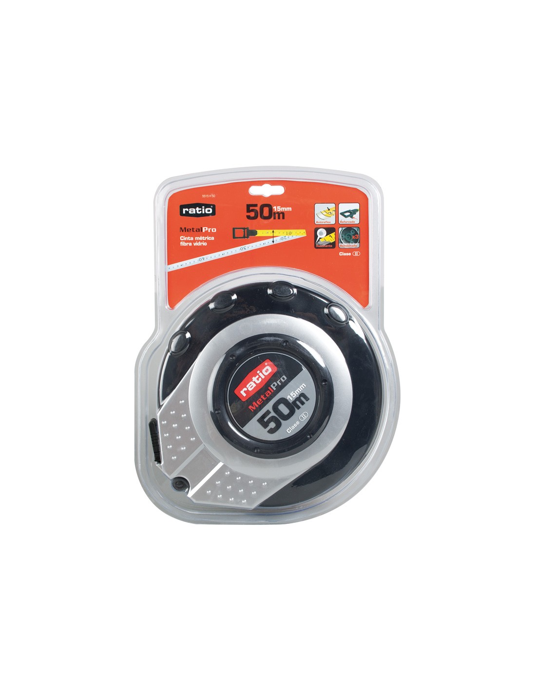Cinta métrica fibra de vidrio RATIO MetalPro 5515 Cuerpo ABS con recubrimiento antideslizante. Cinta bicolor con numeración doble cara. Con revestimiento antireflex. Rebobinado 3 veces más rápido. Homologación CE. Clase de precisión II. 50 m. Cinta 15 mm.