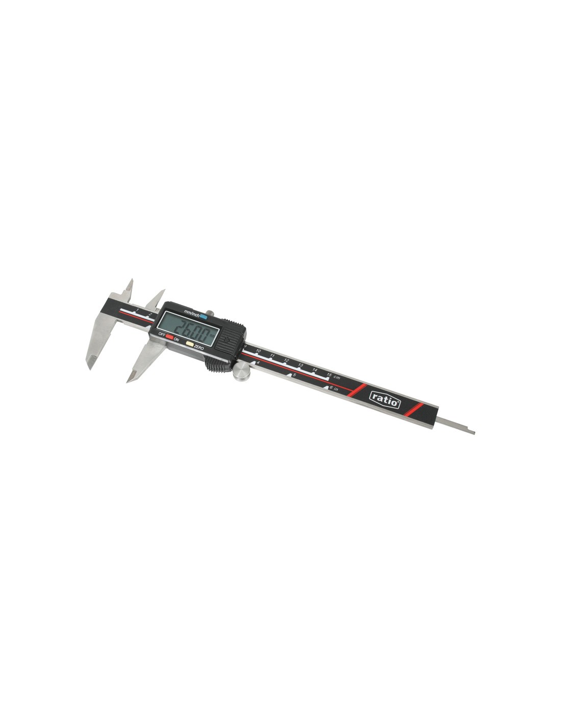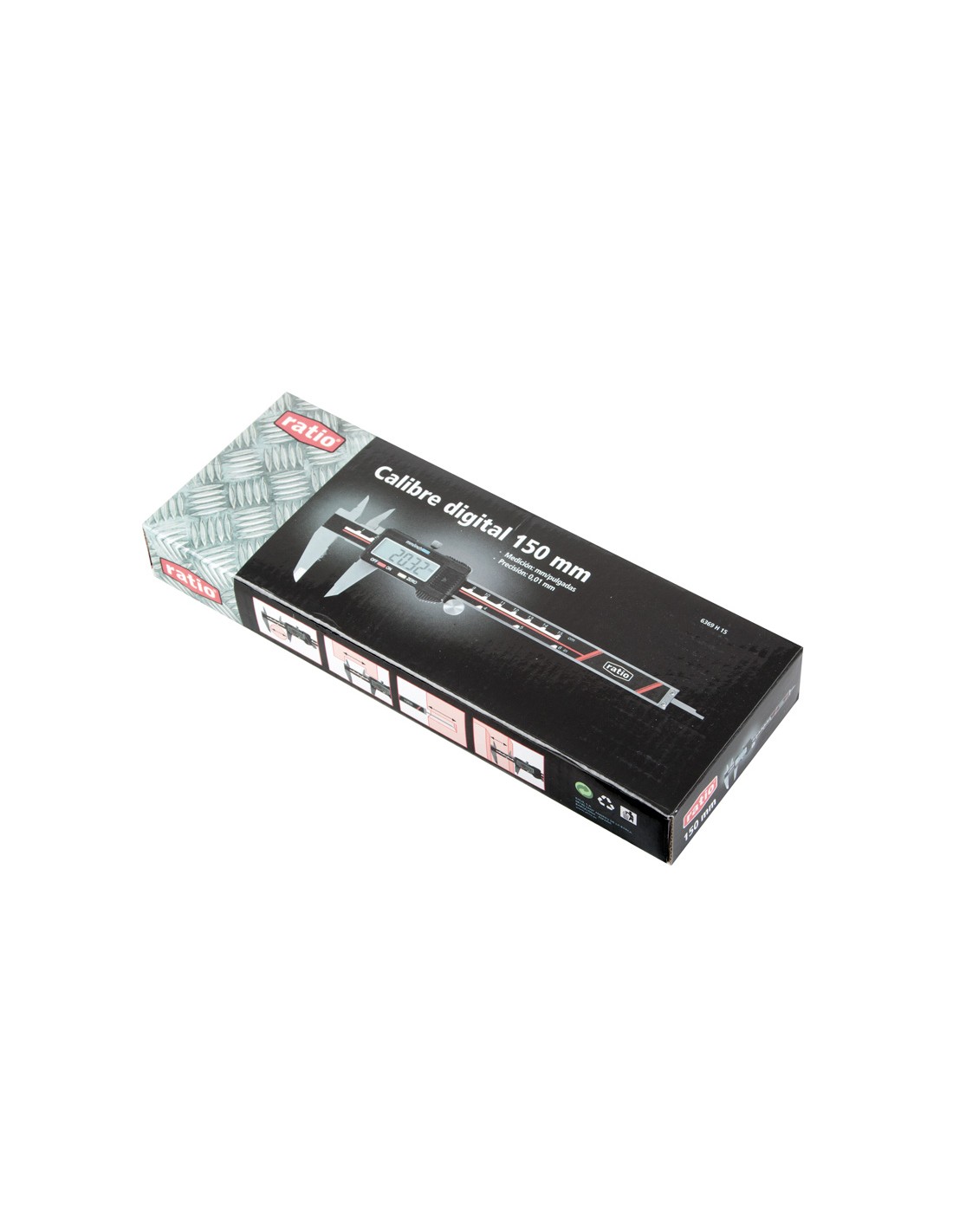 Pie de rey digital RATIO 6369 Doble medición mm/pulgadas. Permite efectuar 4 mediciones: exteriores, interiores, profundidades y alturas. Puede realizar la medición con display apagado, al encenderlo nos indica la medida real de la posición en la que se encuentra el calibre. Estu Longitud 150 mm. Bocas 40 mm. Precisión 0,01 mm.