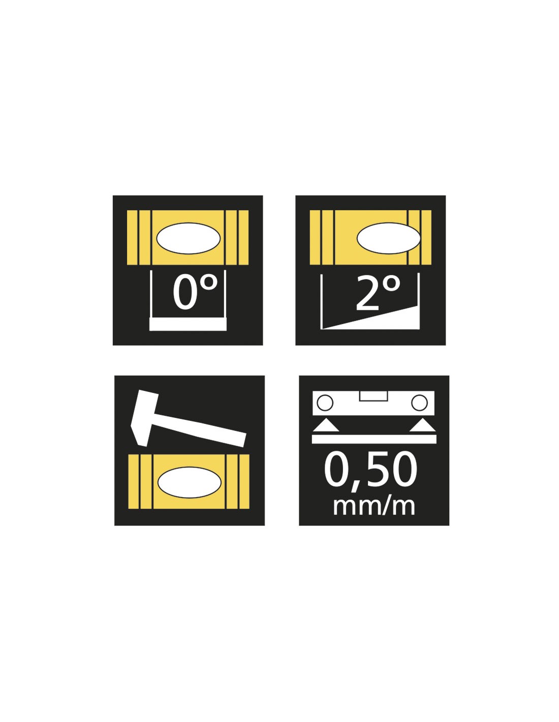 Nivel rectangular RATIO 6981 2 burbujas acrílicas antichoc. Burbuja central redondeada para una perfecta visualización desde cualquier posición, doble marcado 0º y 2º de inclinación. Perfil rectangular reforzado con doble nervadura lateral y refuerzo interior. Base de nivelación 80 cm.