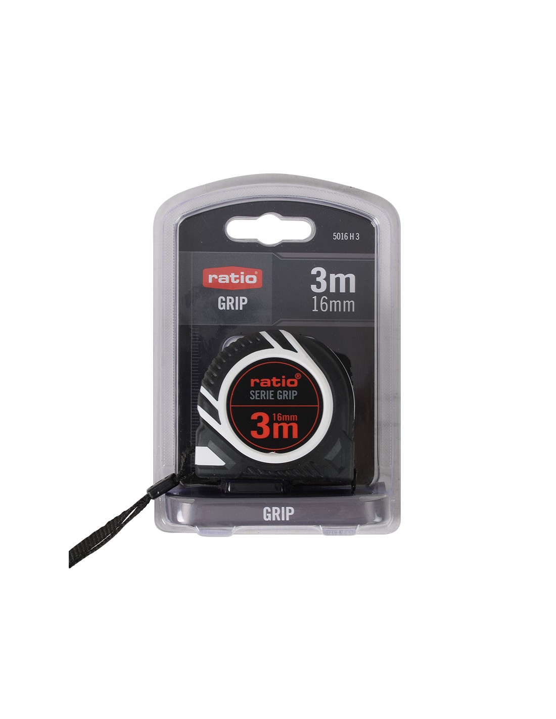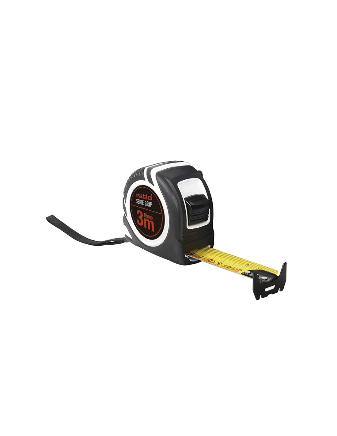 Flexómetro RATIO Grip Carcasa ABS con recubrimiento antideslizante. Cinta numeración doble cara (amarilla/blanca) con revestimiento nilón antireflex. Gancho metálico doble reforzado y botón de bloqueo. Clip para cinturón y correa de mano. Homologado CE, clase de Precisión 3 metros. Cinta 16 mm.