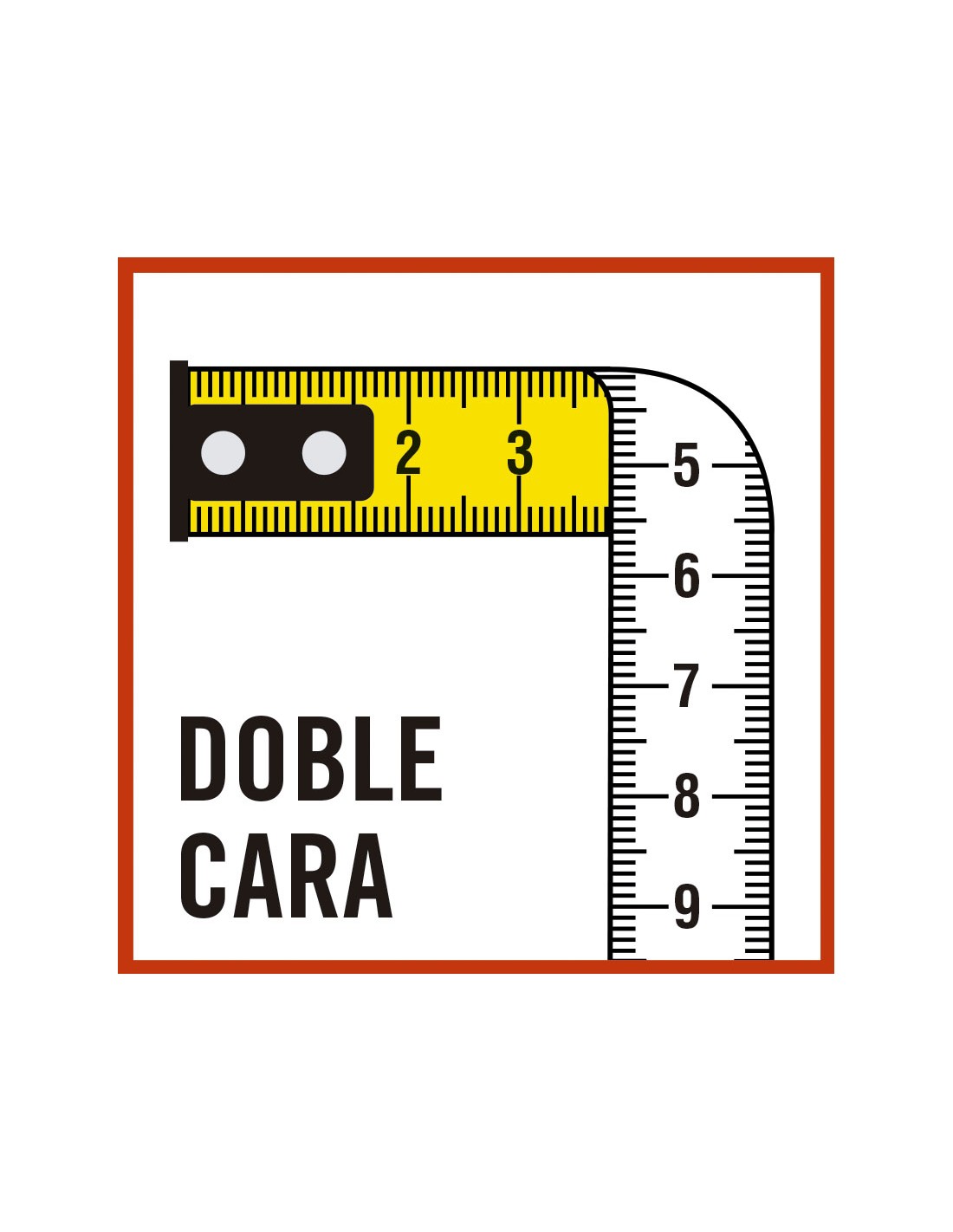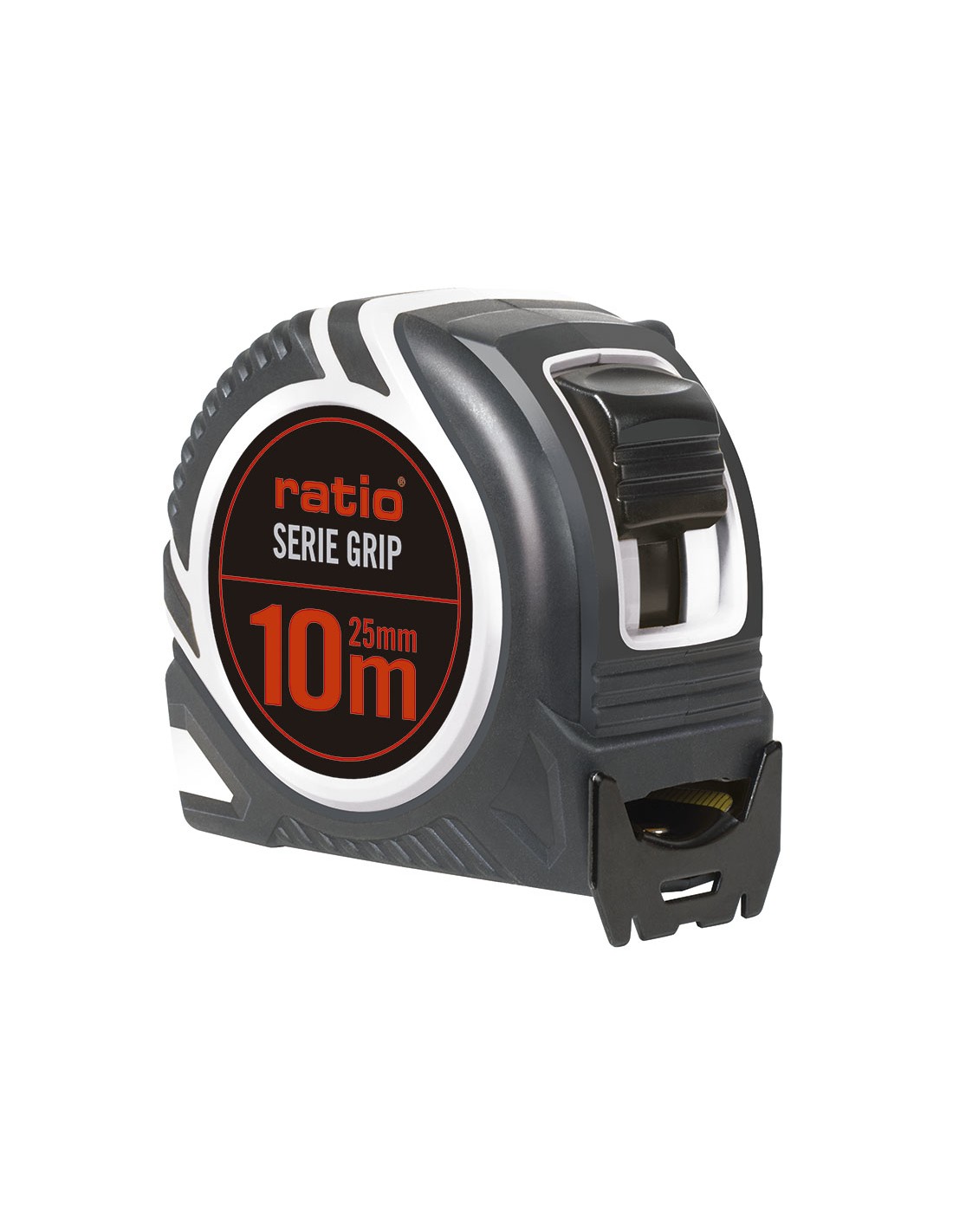 Flexómetro RATIO Grip Carcasa ABS con recubrimiento antideslizante. Cinta numeración doble cara (amarilla/blanca) con revestimiento nilón antireflex. Gancho metálico doble reforzado y botón de bloqueo. Clip para cinturón y correa de mano. Homologado CE, clase de Precisión 10 metros. Cinta 25 mm.\r\nFilm transparente en los primeros 24/27 cm.