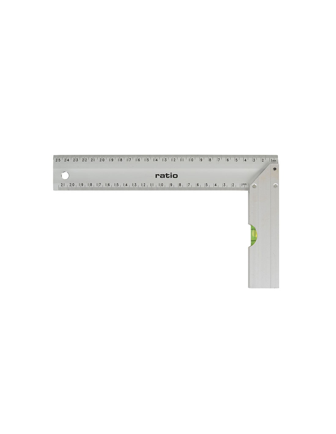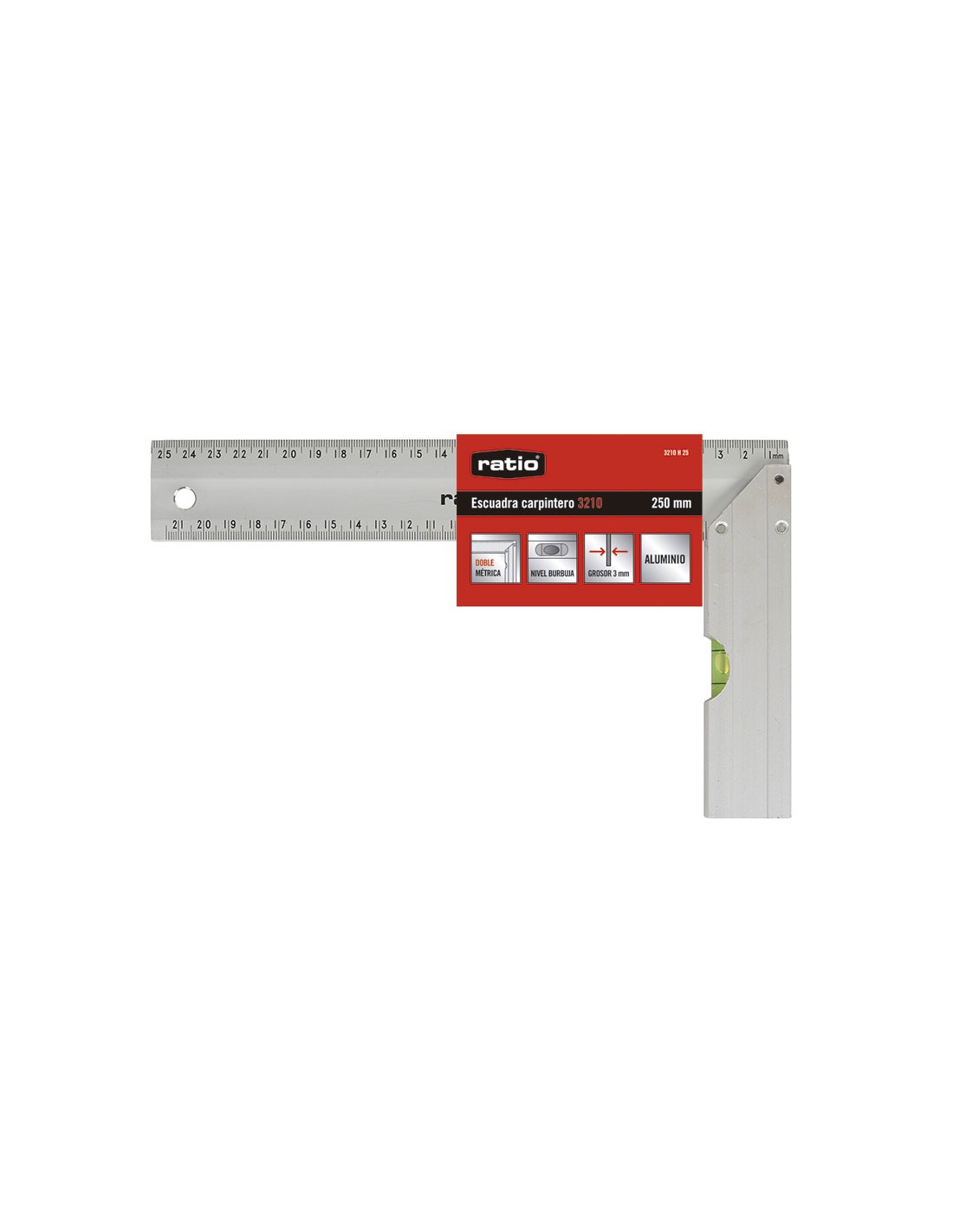 Escuadra carpintero RATIO 3210 Aluminio. Doble escala métrica (en mm. y en mm.). Con burbuja de nivel en el mango. 3 mm grosor. 250 mm.