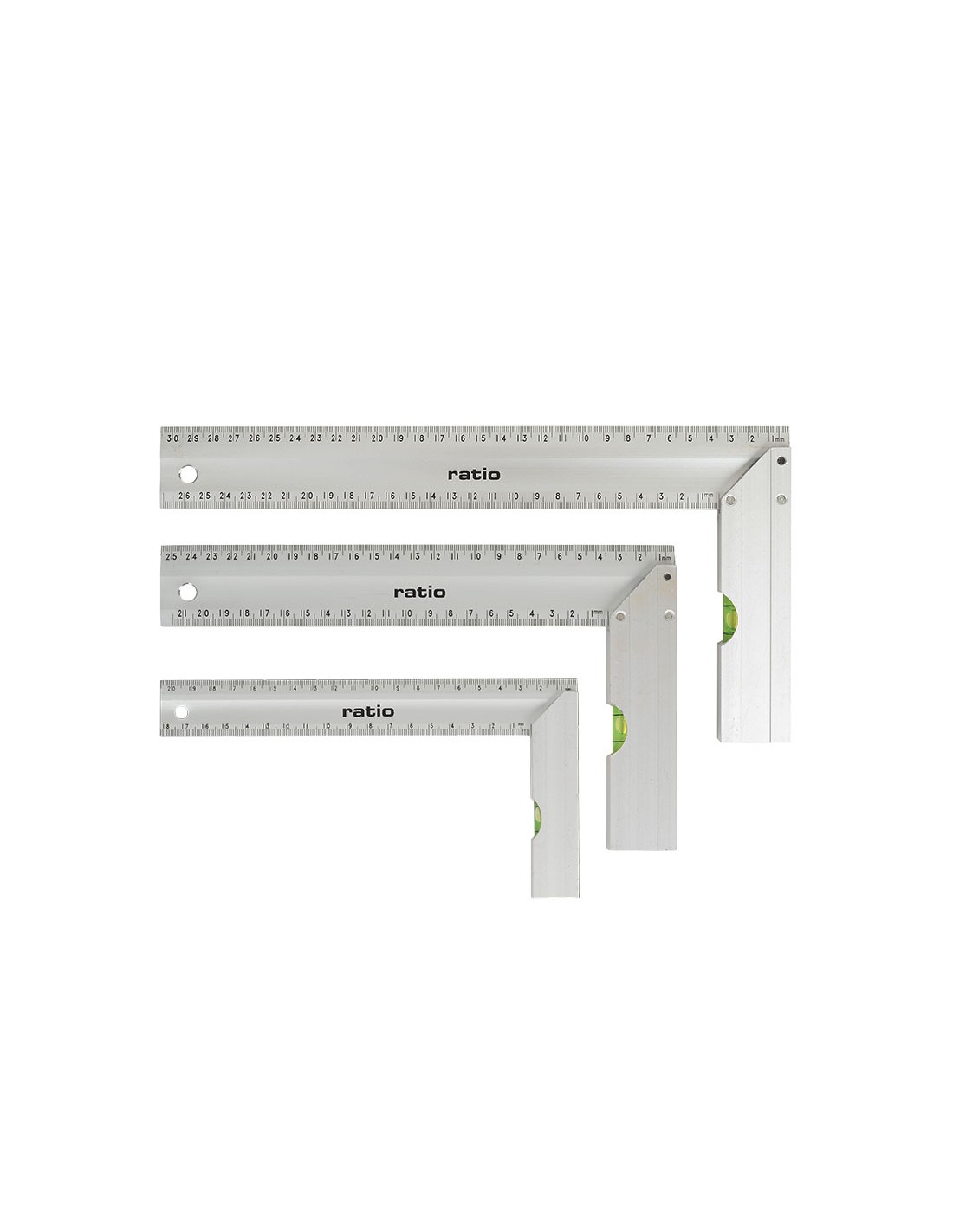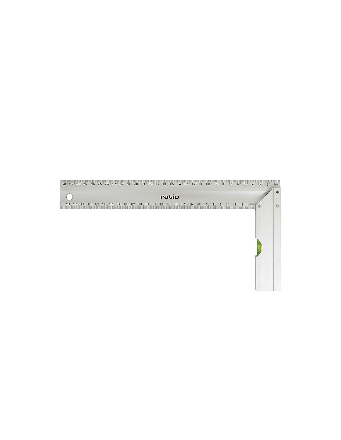 Escuadra carpintero RATIO 3210 Aluminio. Doble escala métrica (en mm. y en mm.). Con burbuja de nivel en el mango. 3 mm grosor. 300 mm.