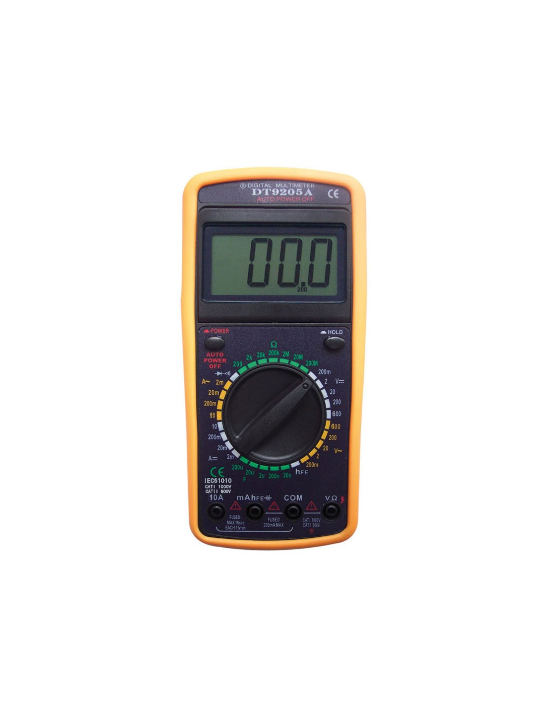 Multímetro digital SILVER DT-9205A. Display LCD 62x34 mm. Prueba de continuidad. Comprobador de diodos. Transistor. Indicaciones de conexión del cable de prueba. Incluye pinzas y pila 9V. Apagado automático. Indicador de pila baja. Voltaje: \r\nC.C. 200 mV / 2-20-200-600 V en C.A. 200 mV / 2-20-200-600 V.\r\nCorriente en C.A 10 A.\r\nResistencia 200 ? / 2-20-200 k? / 2-20-200 m?.\r\nCapacitancia: 20-200 nF/ 2-20-200 uF.