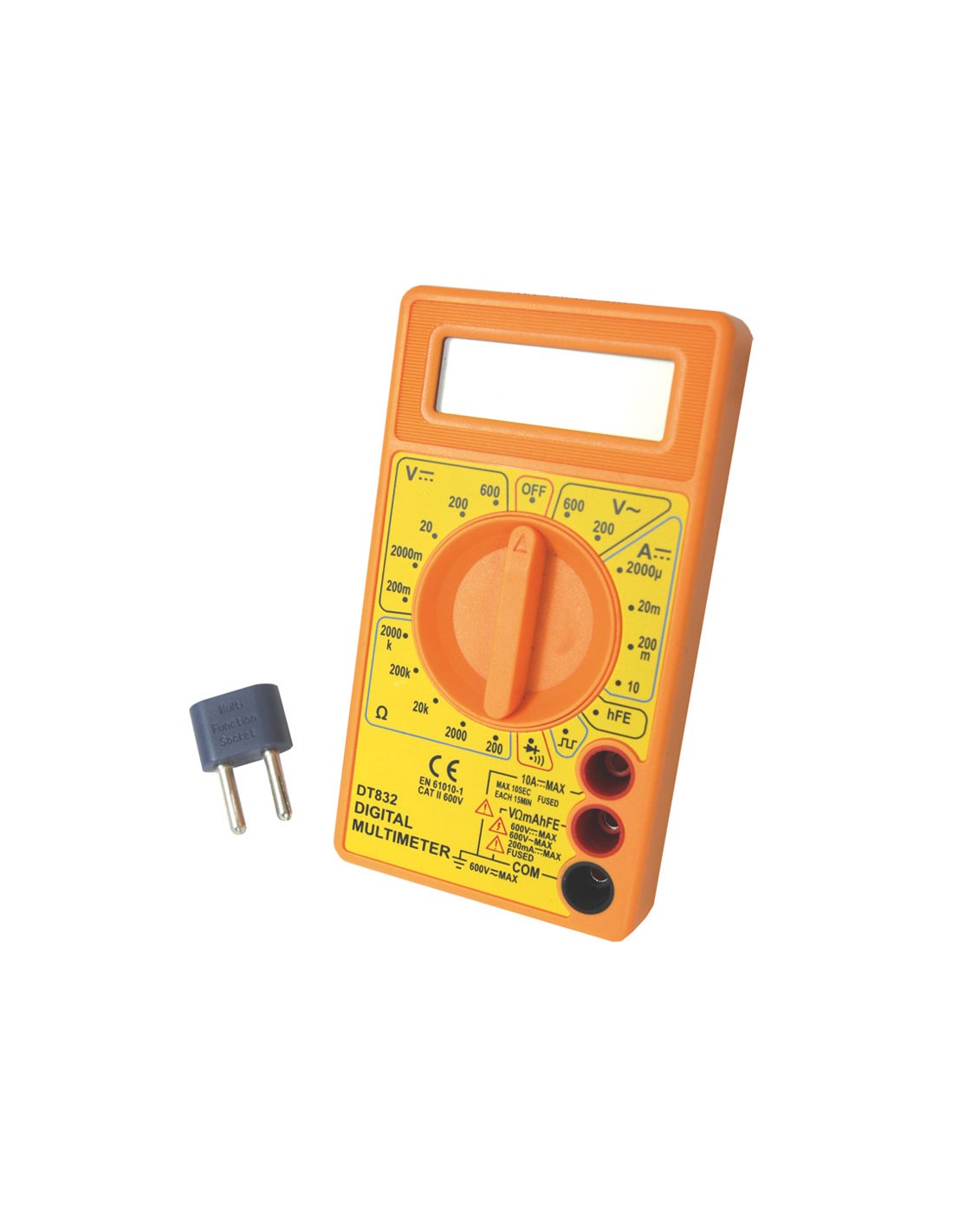 Multímetro digital SILVER DT-832. Display LCD 49x16 mm. Prueba de continuidad. Comprobador de diodos. Indicaciones de conexión del cable de prueba. Incluye pinzas y pila 9 V. Indicador de sobrecarga. Comprobador transistor. Voltaje: