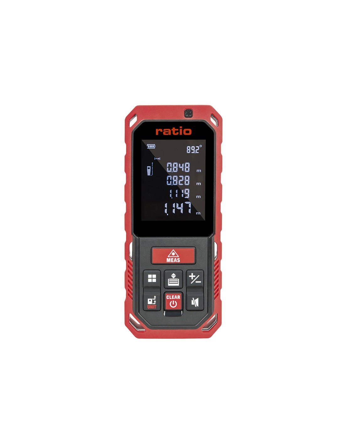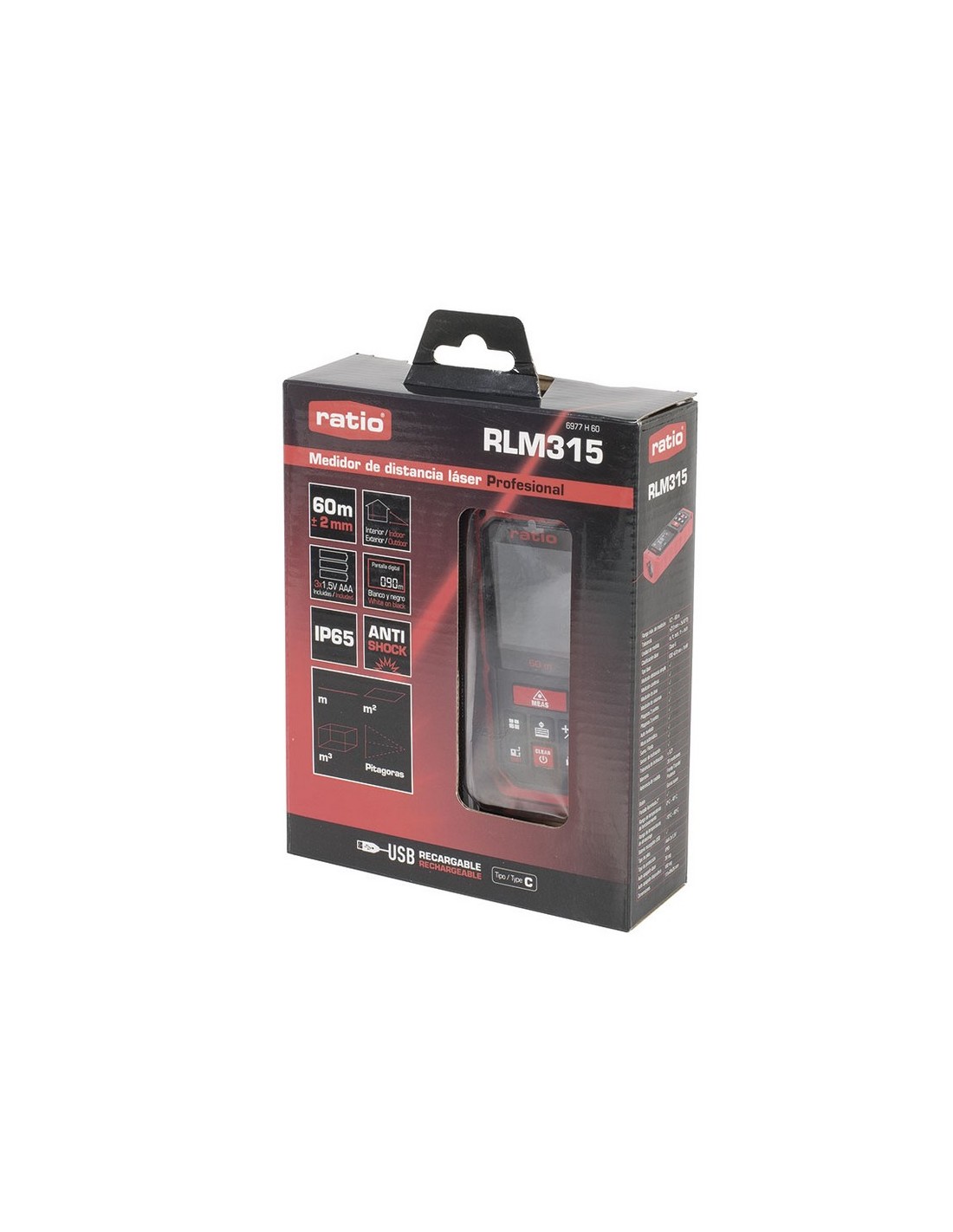 Medidor distancias láser recargable RATIO RLM315. Manejo sencillo, preciso y fiable. Incluye 3 baterías recargable Ni-Mh, 5.000 ciclos. Cable USB tipo C. Láser apagado automático 30 seg. Dispositivo apagado automático 180 seg. Sensor de ángulo. Medición en metros, pies y pulgadas. 20 memorias. Pantalla retroiluminada. Teclado de goma suave. Funda protectora y correa de mano. Alcance de trabajo: 60 m.