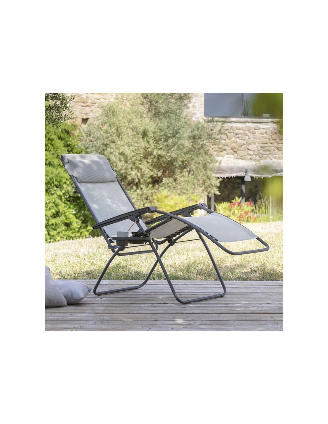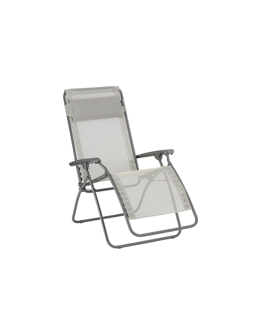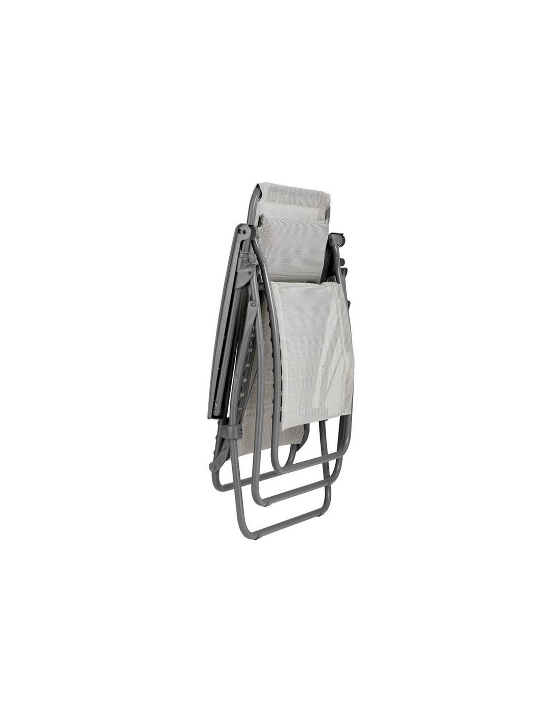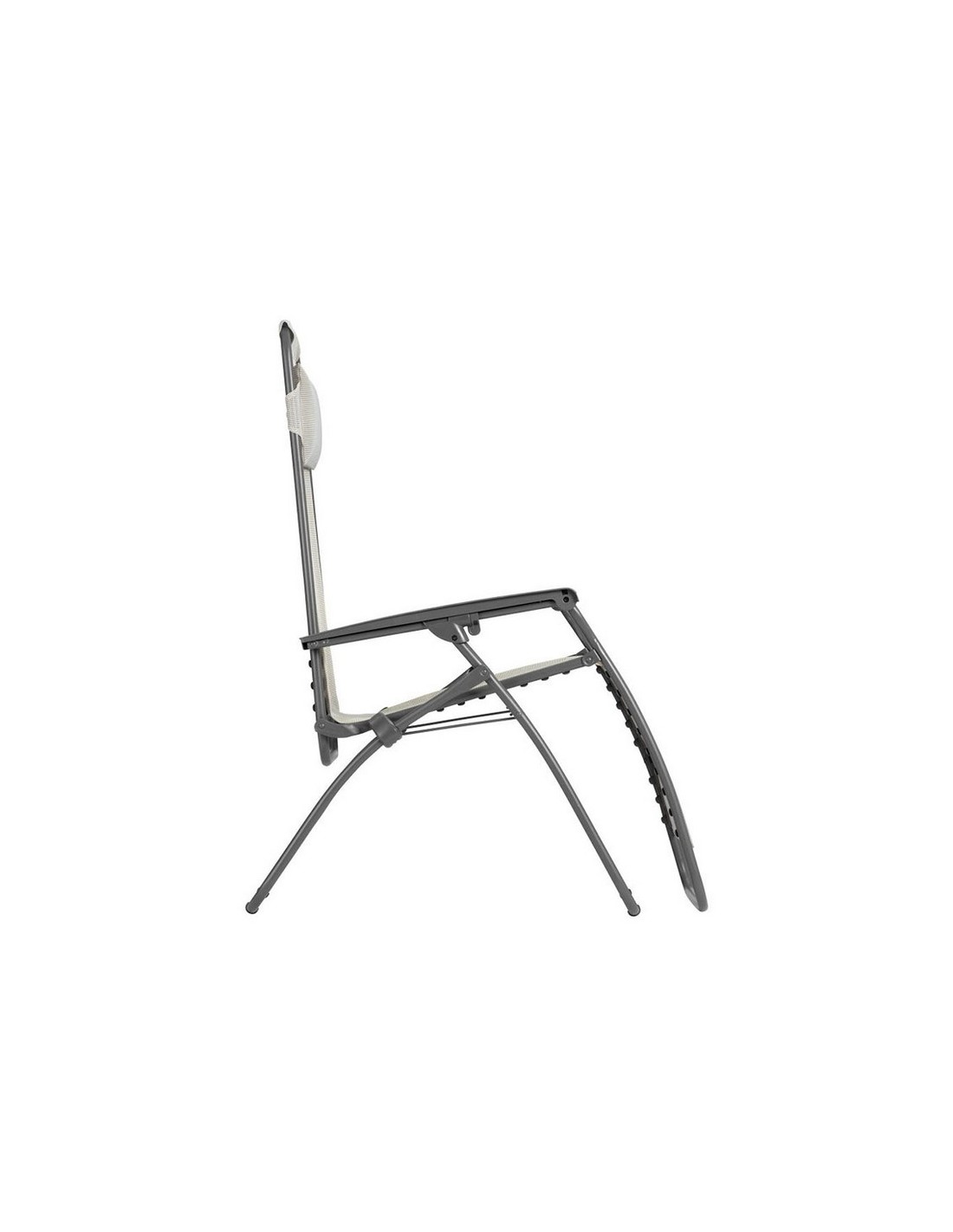 Sillón multiposición LA FUMA Tubo de acero. Resistente a los rayos UV. Tejido desmontable y sustituible con fijación mediante clips. Medidas abierta: 67x88/163xh.81/114 cm. Medidas plegada: 67x17xh.99 cm. Peso máx: 6600 Kg. Gris claro.