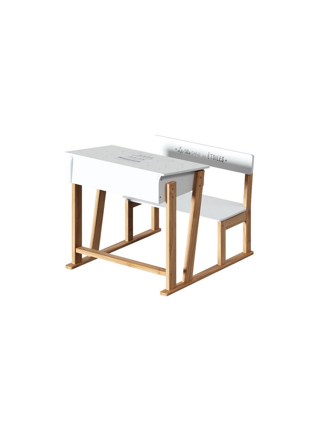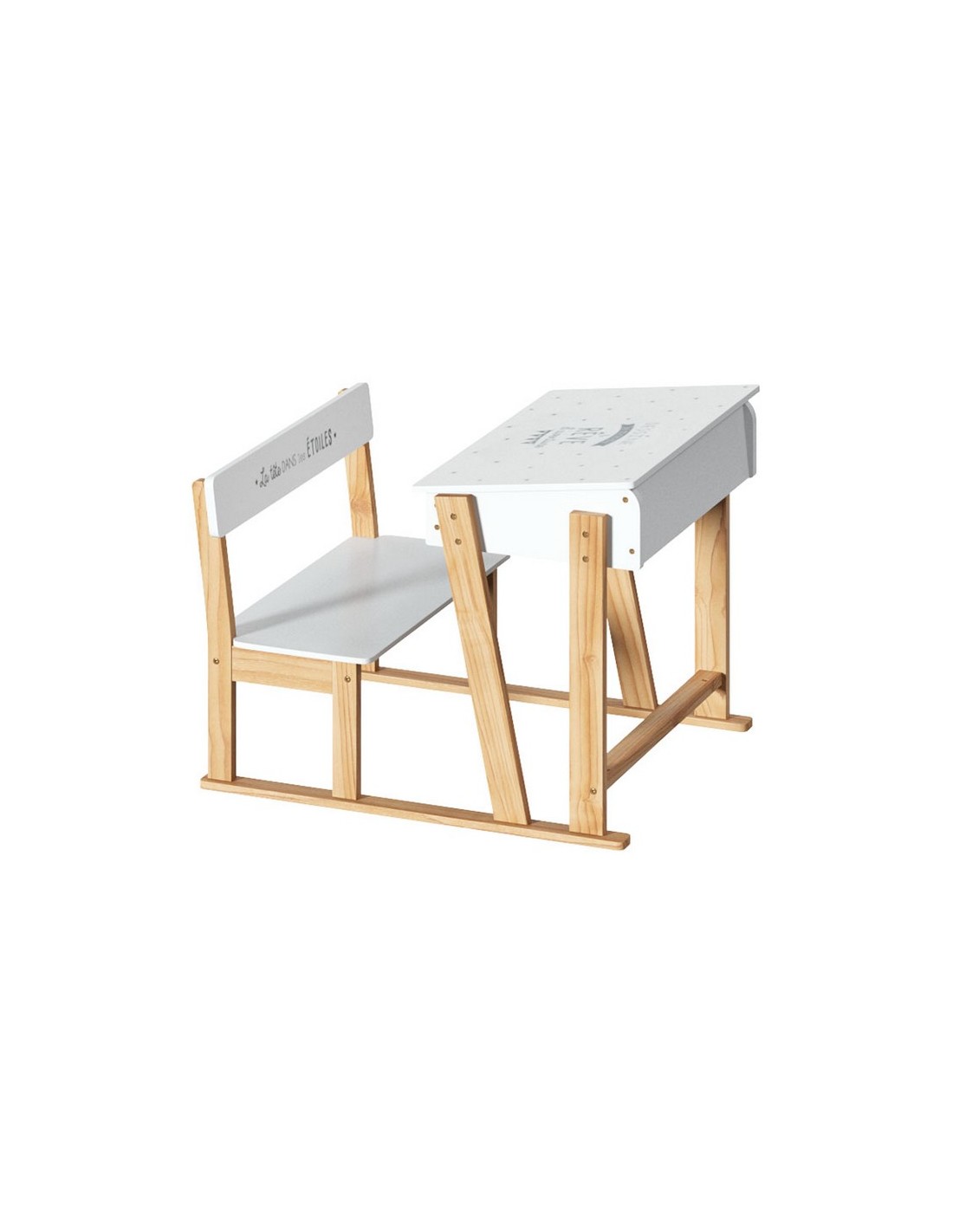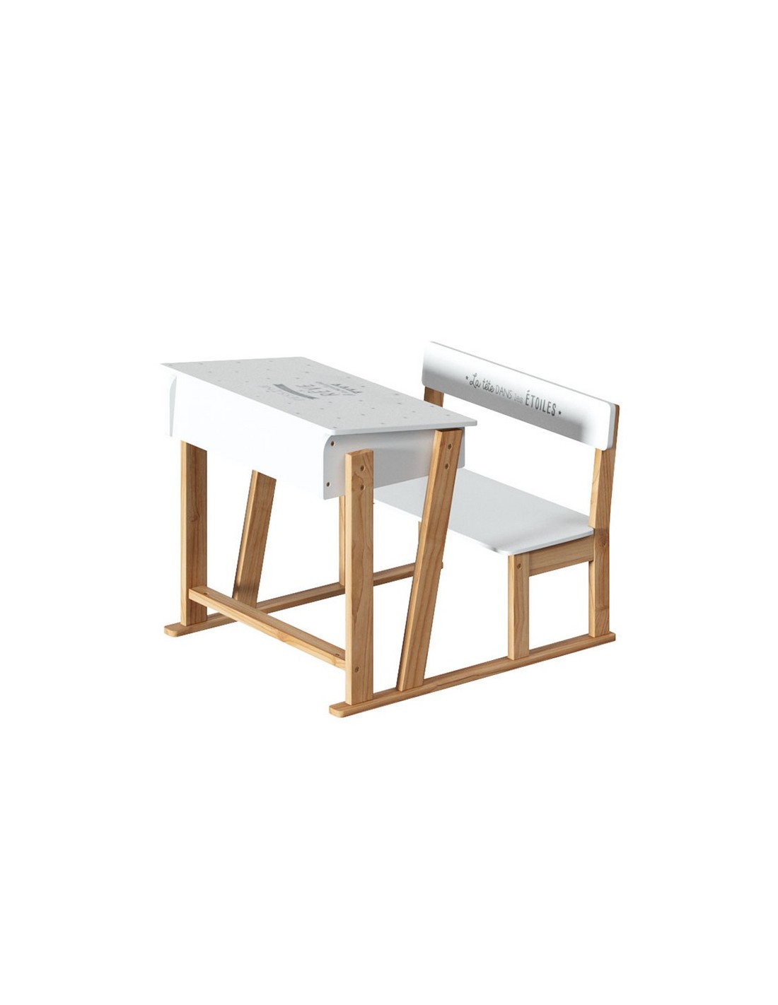 Escritorio / pupitre infantil Ecriture Banco integrado. Compartimento interior. Madera MDF y patas de pino macizo. Color blanco. 63,5x58xh.79 cm.
