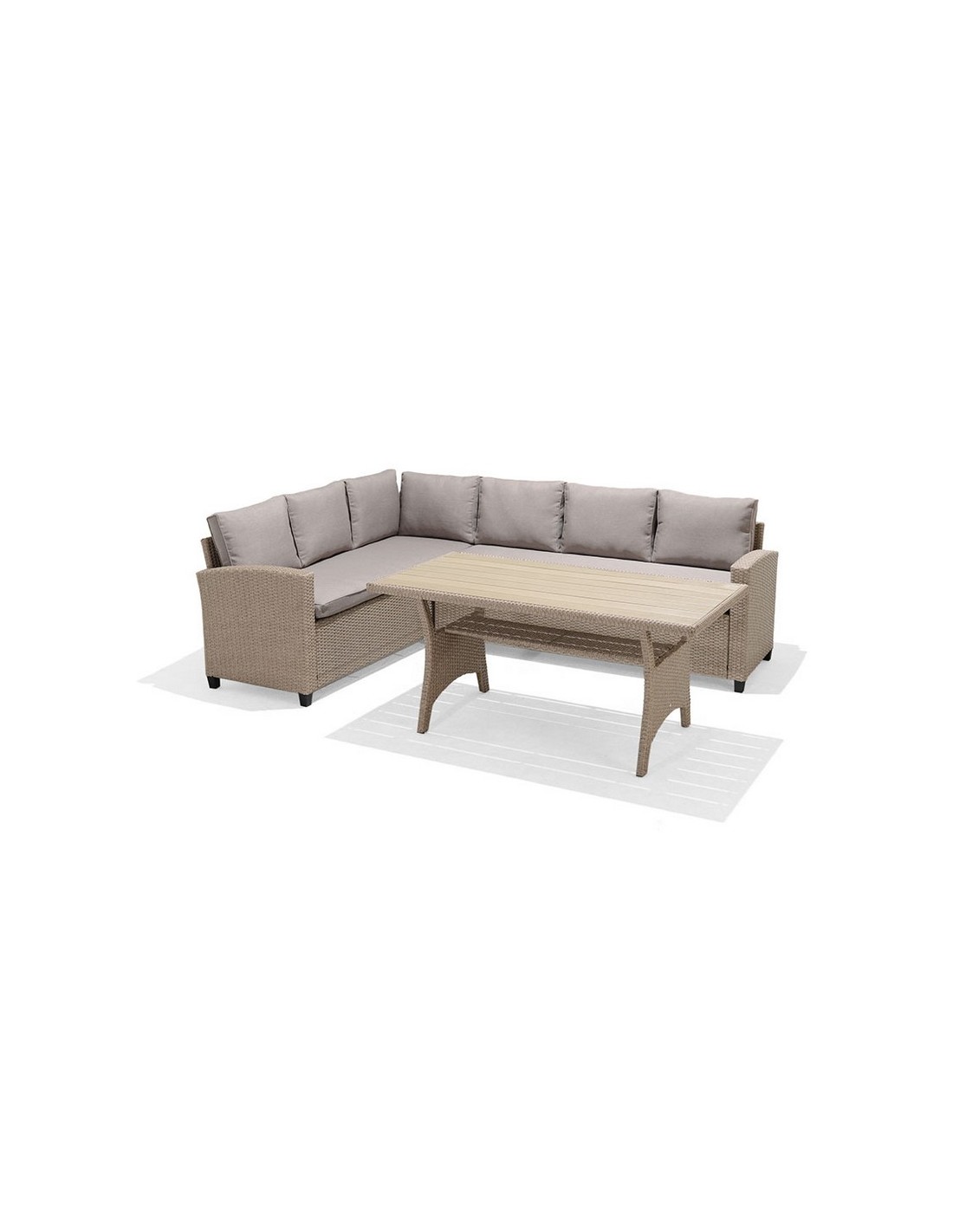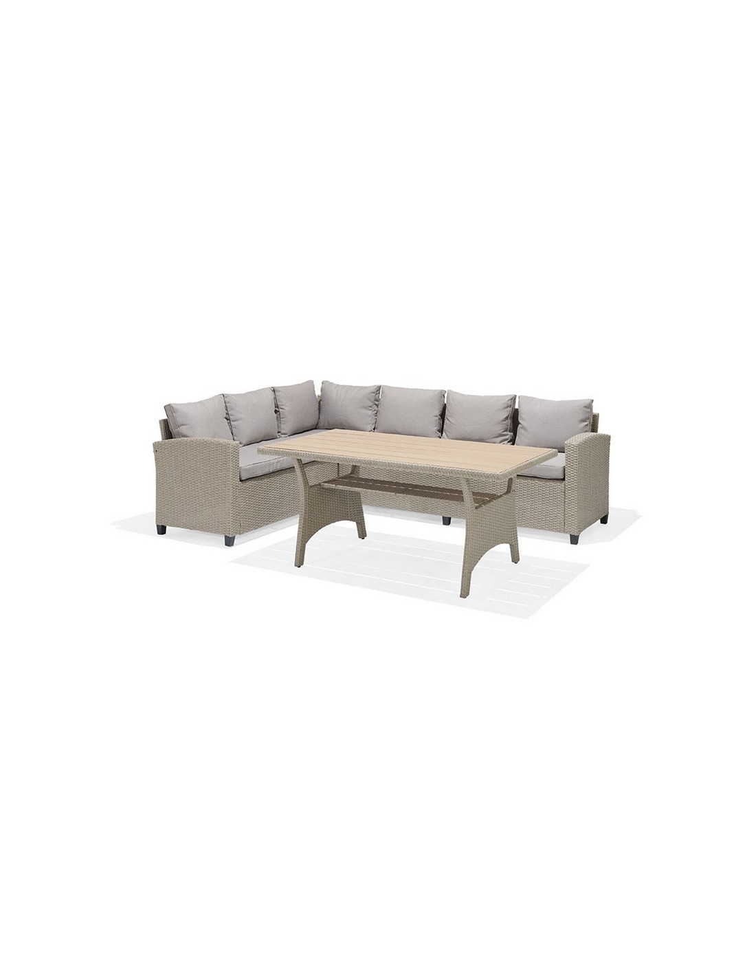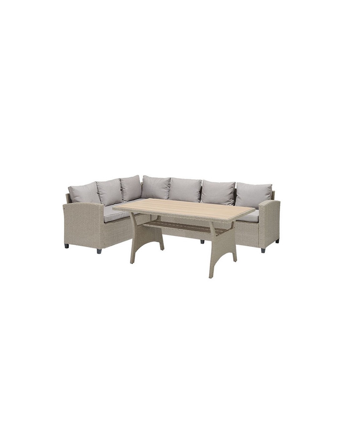 Conjunto Santorini Estructura aluminio/ratán sintético. 2 sofás y mesa alta con superficie imitación madera. Cojines de poliéster color beige incluidos, de 200 gr y 9 cm. de altura. Tela no repelente al agua. Sofá rinconero: 179x62,2xh.73 cm.