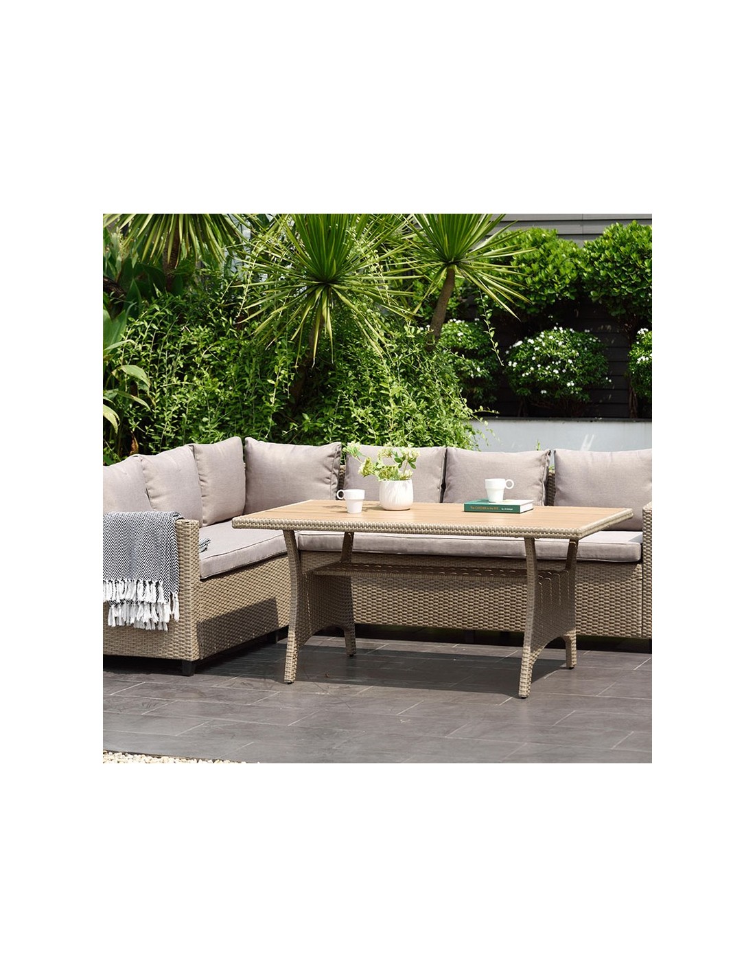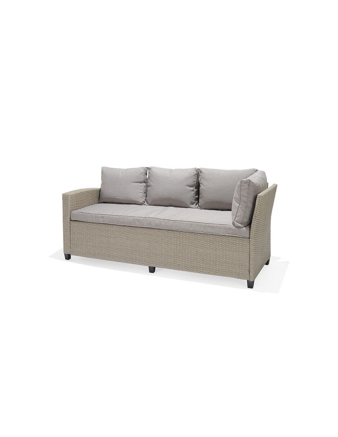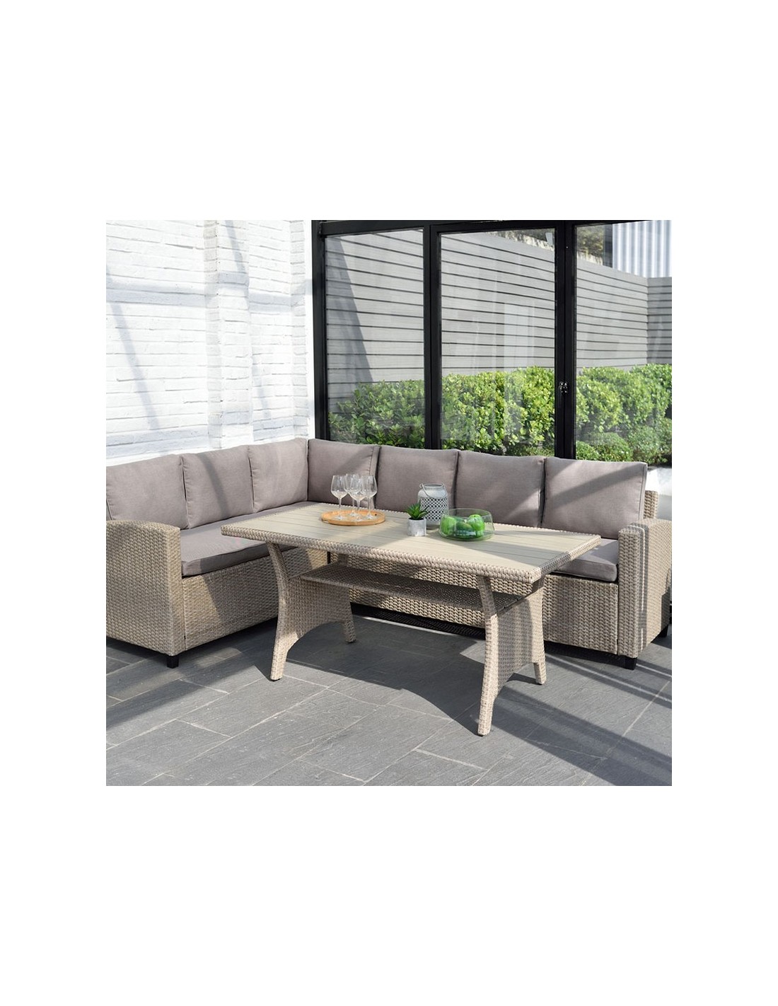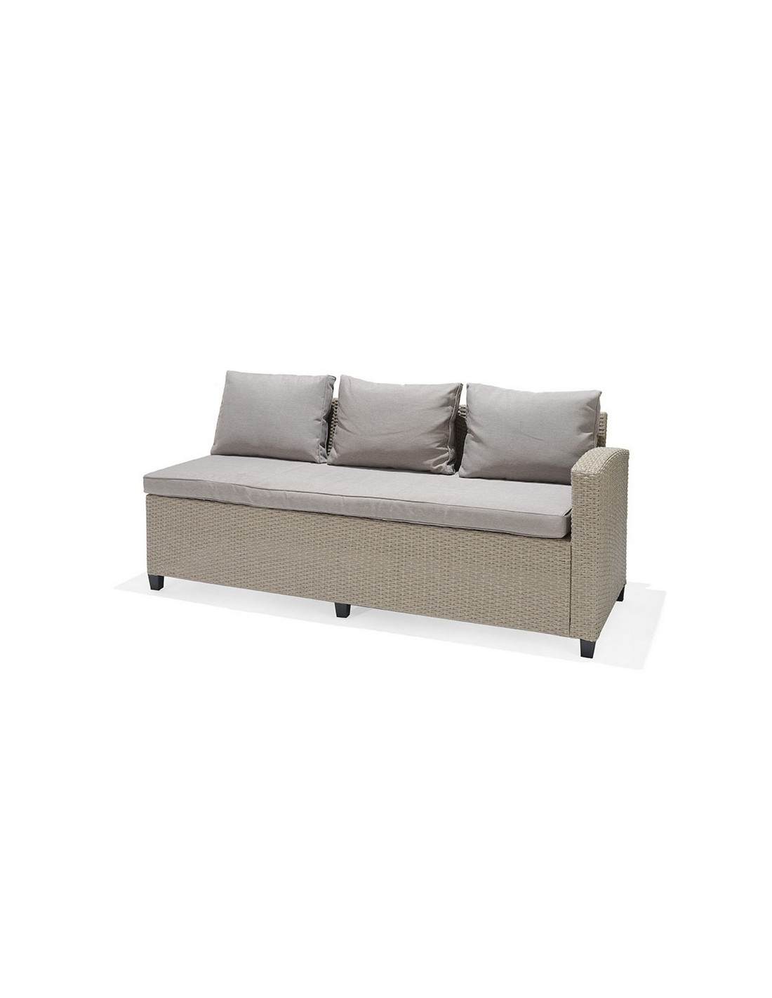 Conjunto Santorini Estructura aluminio/ratán sintético. 2 sofás y mesa alta con superficie imitación madera. Cojines de poliéster color beige incluidos, de 200 gr y 9 cm. de altura. Tela no repelente al agua. Sofá rinconero: 179x62,2xh.73 cm.