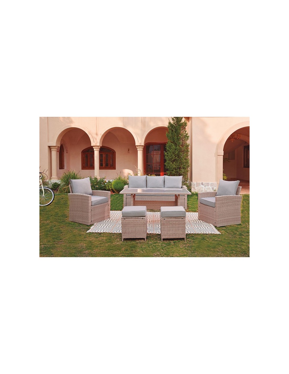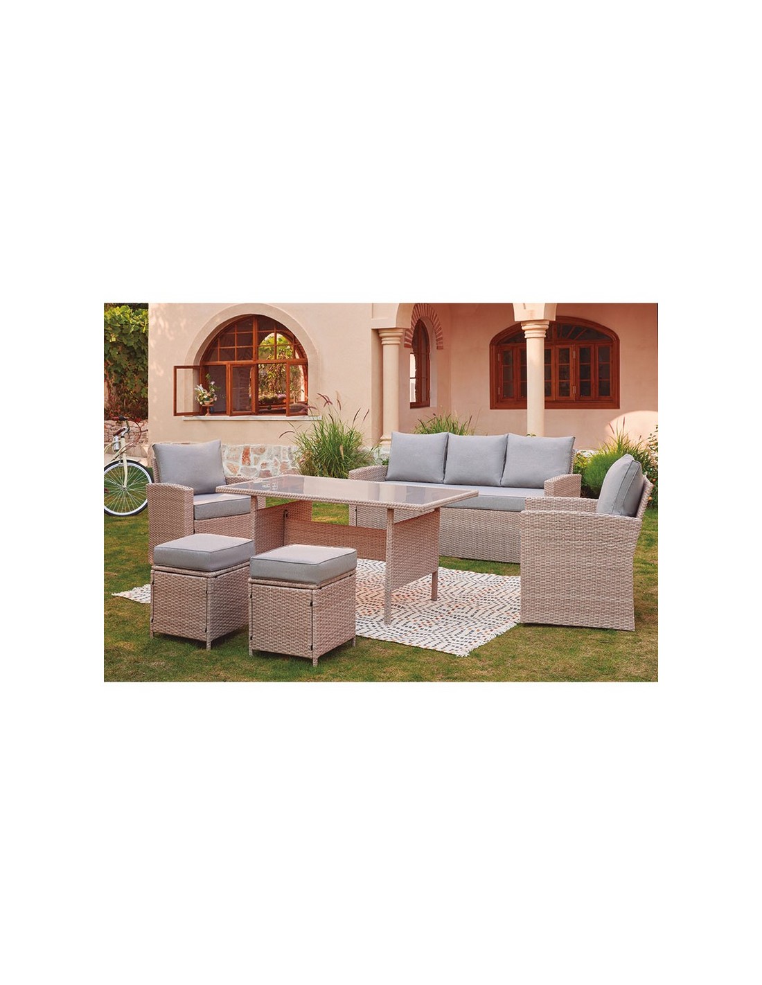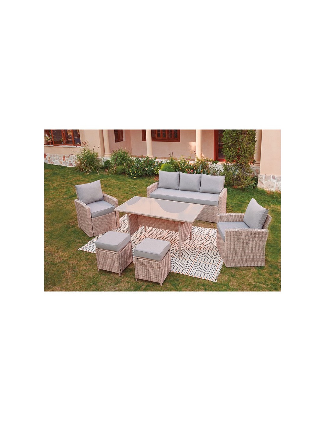 Este conjunto viene compuesto por una estructura metálica y tejido de ratán sintético plano, ideal para exteriores gracias a su gran resistencia a la intemperie. Dispone de un diseño elegante y de gran comodidad, donde lo coloques hará de el, un espacio especial para disfrutar del tiempo libre. Este conjunto está compuesto por 1 sofá de 3 plazas de dimensiones 177x72xh.80 cm, 2 sillones de 67x72xh.80cm, 2 taburetes de 40x40xh.44 cm y mesa alta con superficie en cristal templado de dimensiones 1405x80xh.70. Los cojines están fabricados en un material idóneo para exteriores. Atención, este conjunto no viene montado y se sirve en 2 cajas.