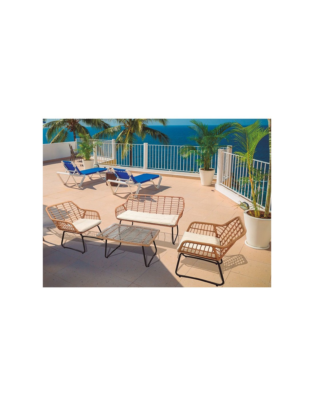 Conjunto de jardín Sitges Estructura metálica color negro y ratán sintético anudado. Cojines poliéster. Mesa superficie cristal templado. Sofá 2 plazas. 119x69xh.85 cm.
