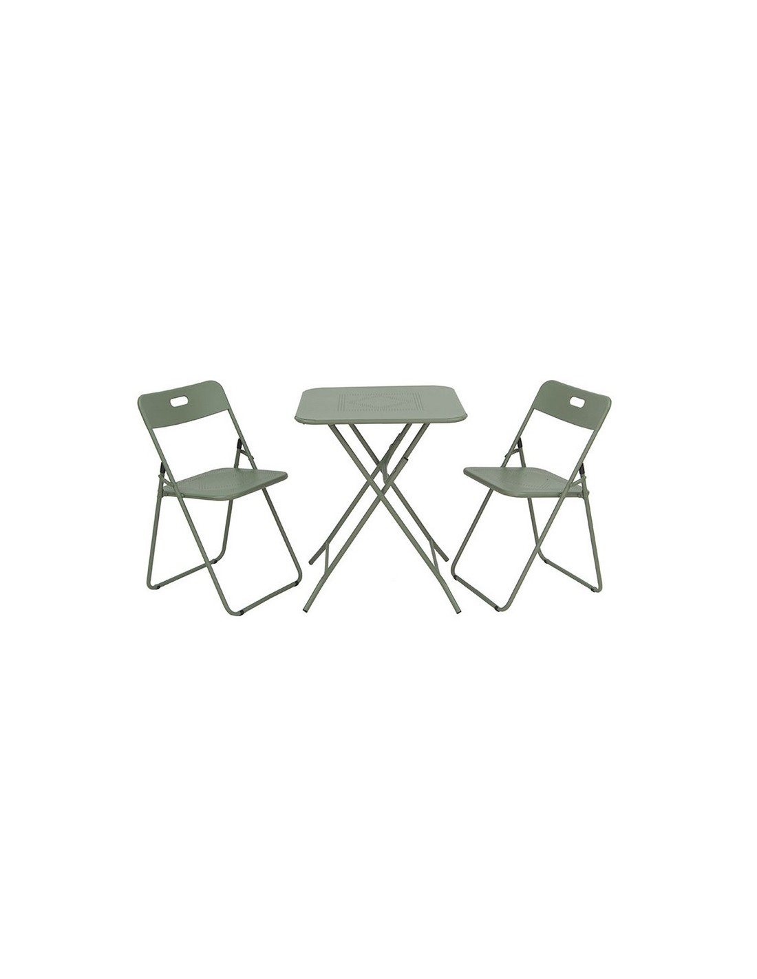 Conjunto mesa cuadrada + 2 sillas plegable Agata Metálico totalmente plegable. Pintura protectora. Uso interior y exterior. Mesa tubo de acero de 19 x 0,8 mm con placa metálica. Silla tubo de acero de 16 x 1,2 mm con asiento y respaldo metálico. Mesa: 60x60xh.73 cm.