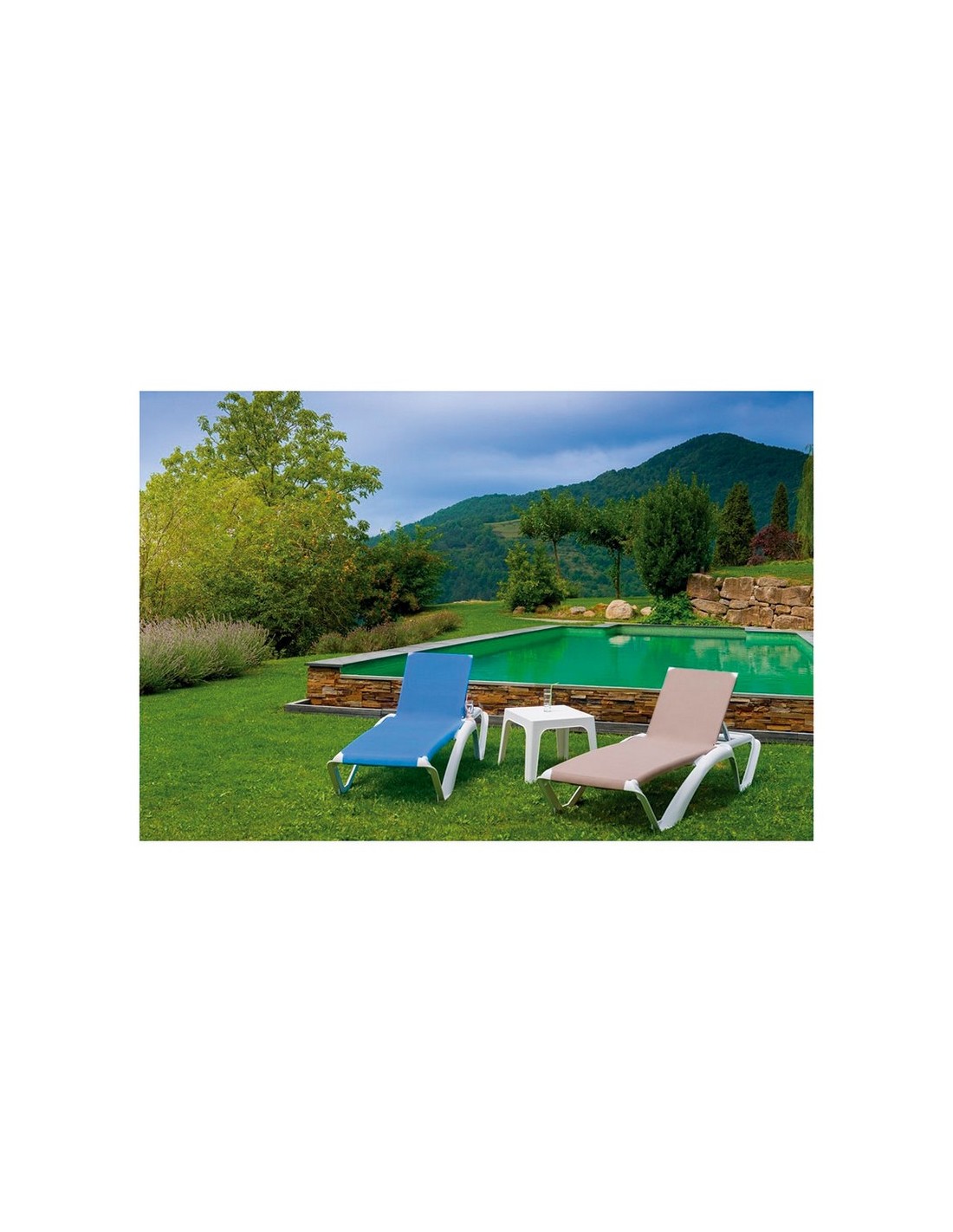 Tumbona resina apilable RESOL Acqua Estructura en polipropileno y fibra de vidrio color blanco. Textilene termosoldado. Ruedas en patas traseras. Incorpora portavasos. Reclicable 4 posiciones. 73x190xh.35 cm. Peso máximo 110 Kg. Blanca/azul.