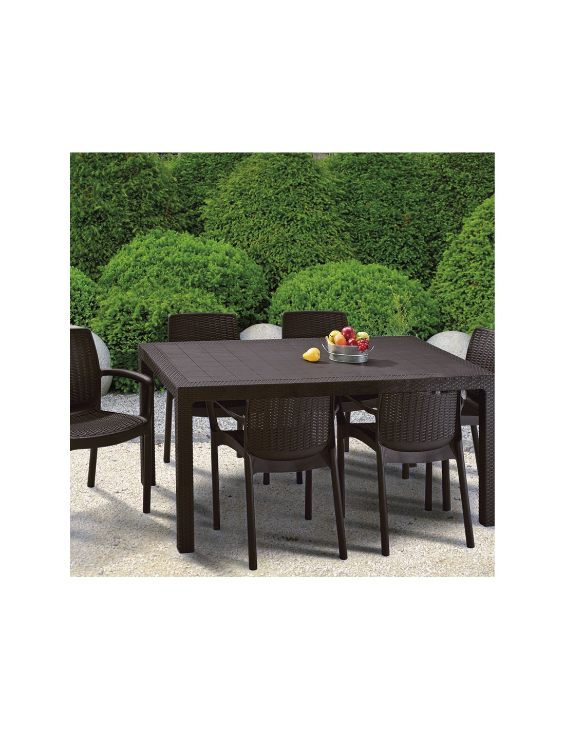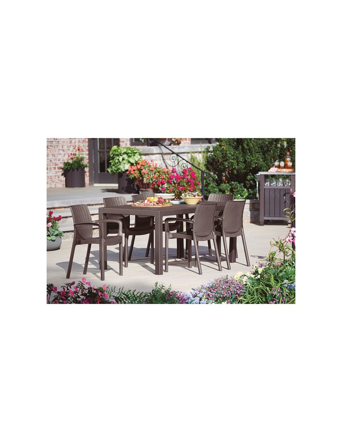 Conjunto jardín imitación ratán KETER. Resina inyectada imitación ratán plano. Color marrón. Duradero y resistente al clima y a la corrosión. Mesa Melody. 160,5x94,5xh.74 cm.