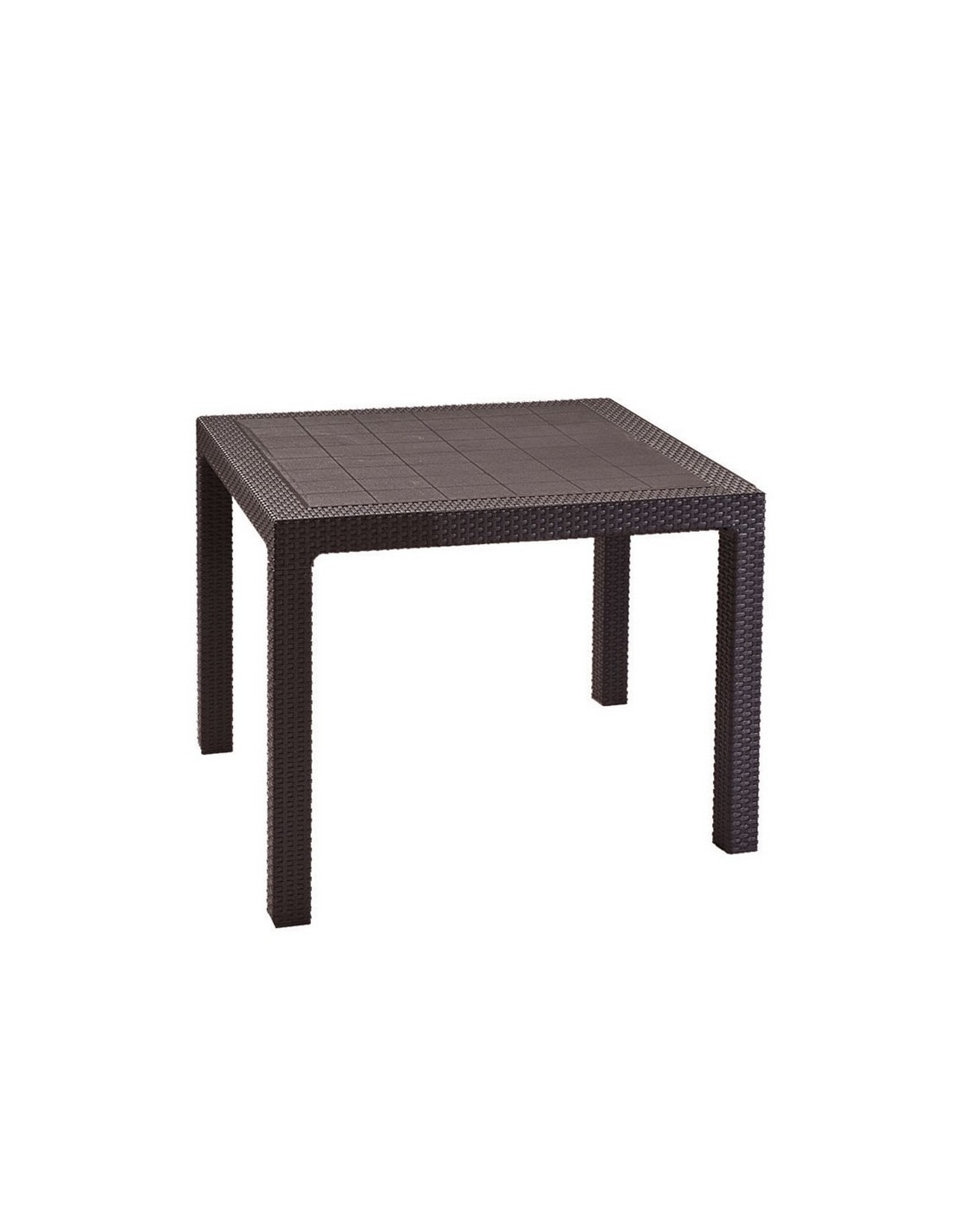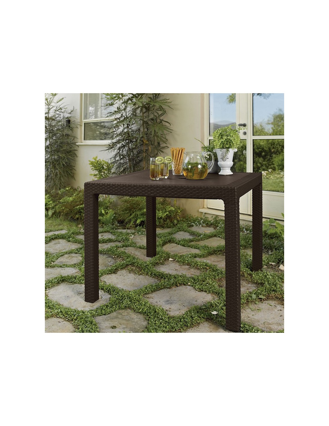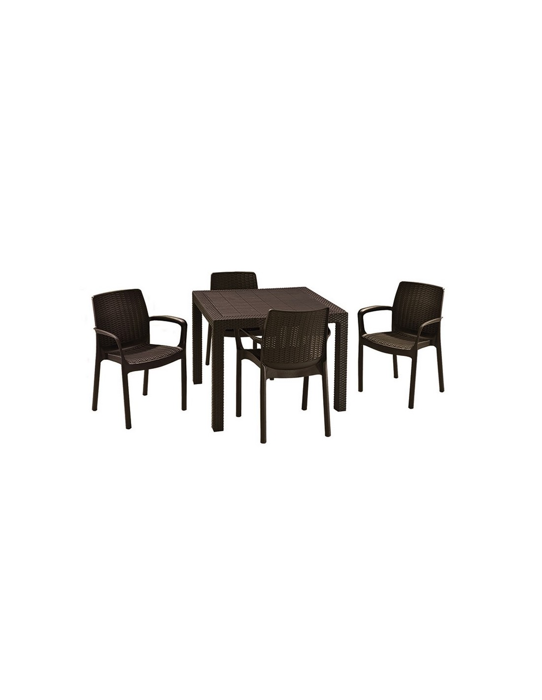 Conjunto jardín imitación ratán KETER. Resina inyectada imitación ratán plano. Color marrón. Duradero y resistente al clima y a la corrosión. Mesa Quarted 94x94xh.75 cm.