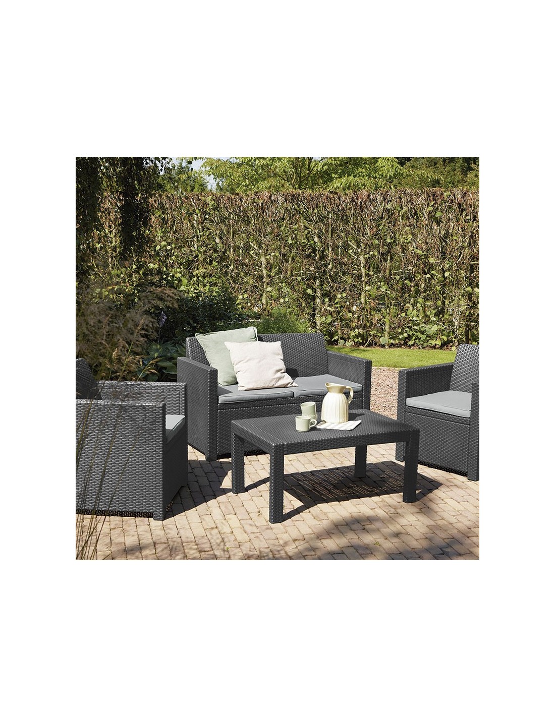 Conjunto jardín KETER Merano. Resina inyectada imitación ratán plano 7 mm. Color antracita. Duradero y resistente al clima y a la corrosión. Cojines incluidos. Conjunto 4 piezas: