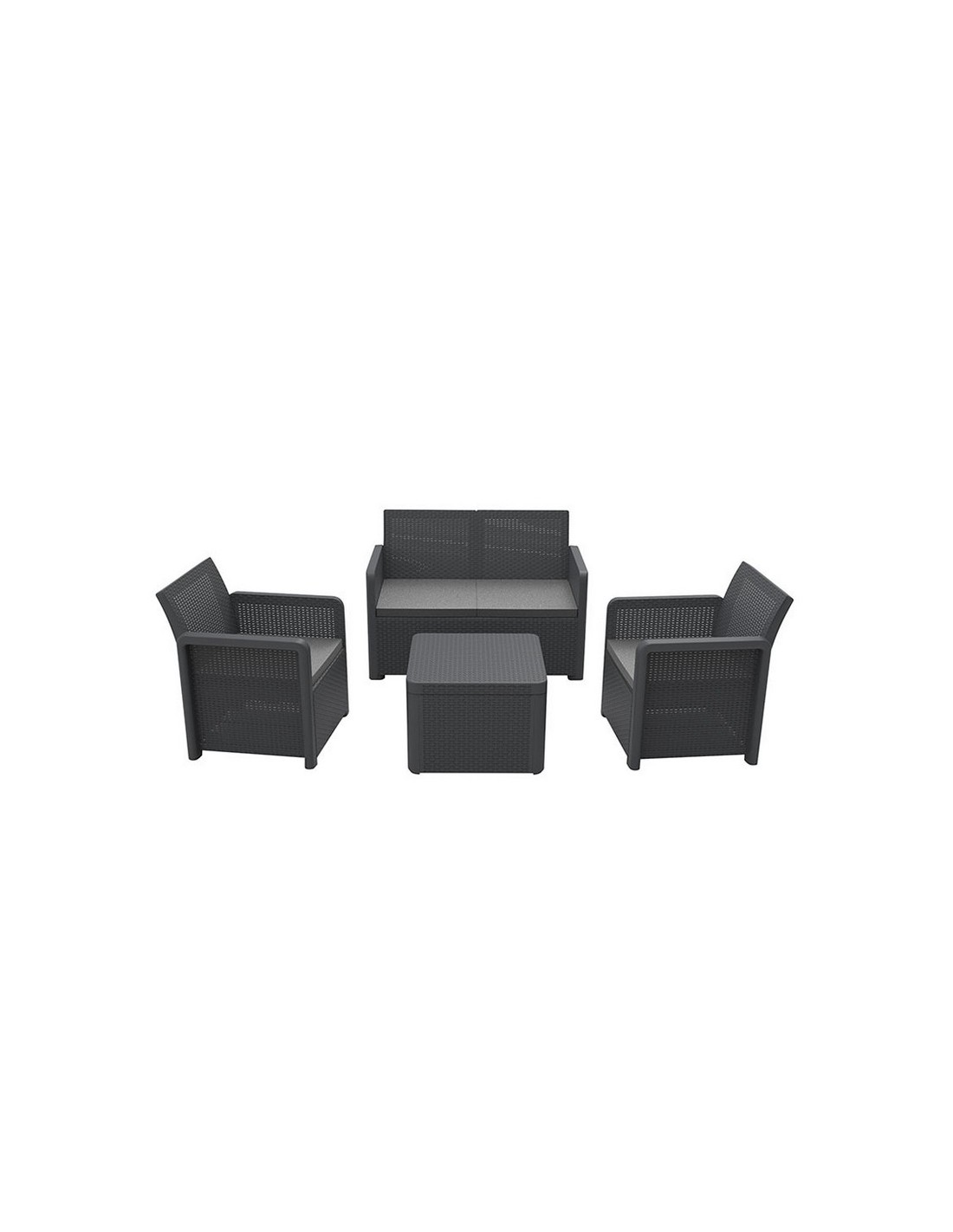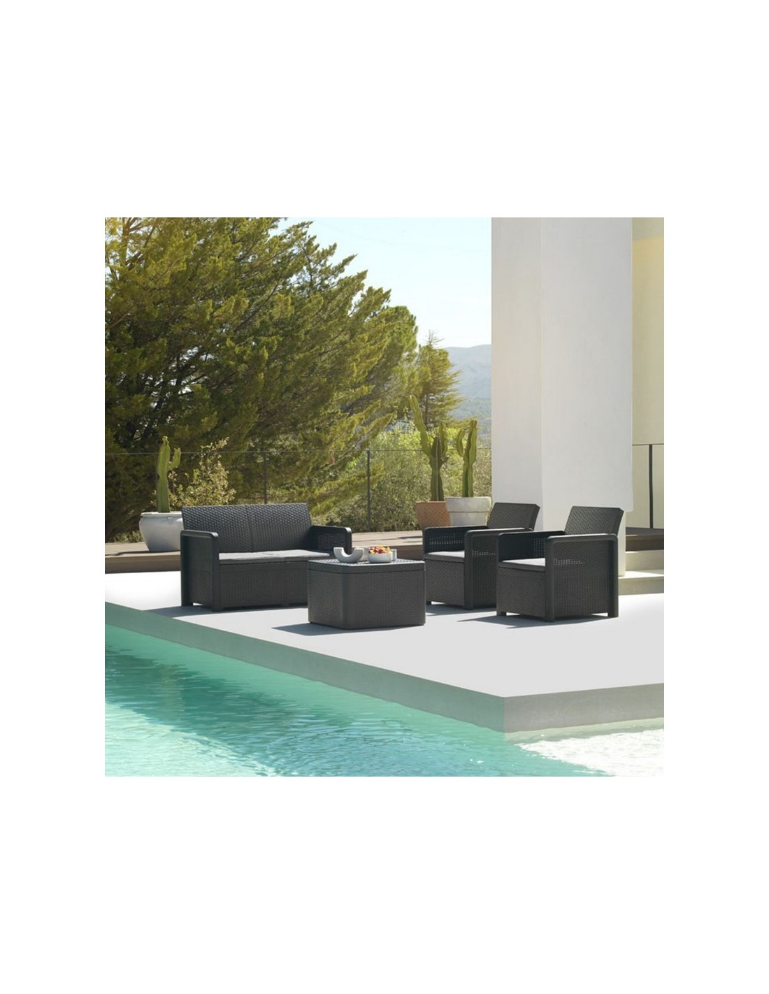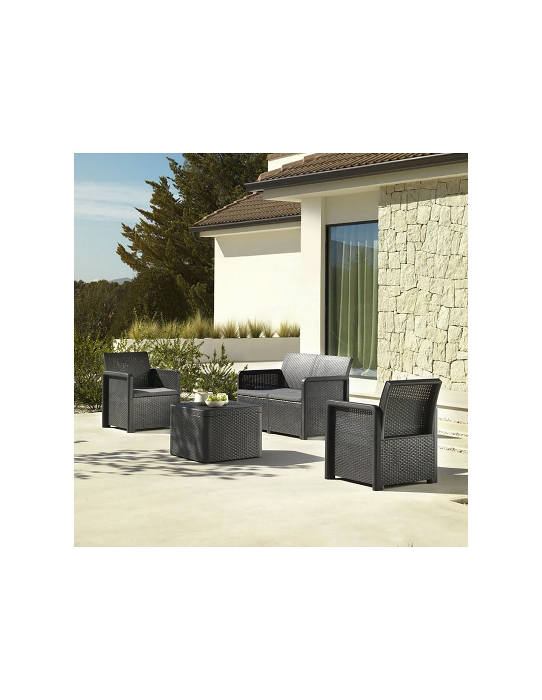 Conjunto NASSAU Storage Polipropileno color grafito. Capacidad de almacenaje en la mesa. Cojines en polialgodón color gris oscuro. Sofá 2 plazas: 109x60xh.74 cm.