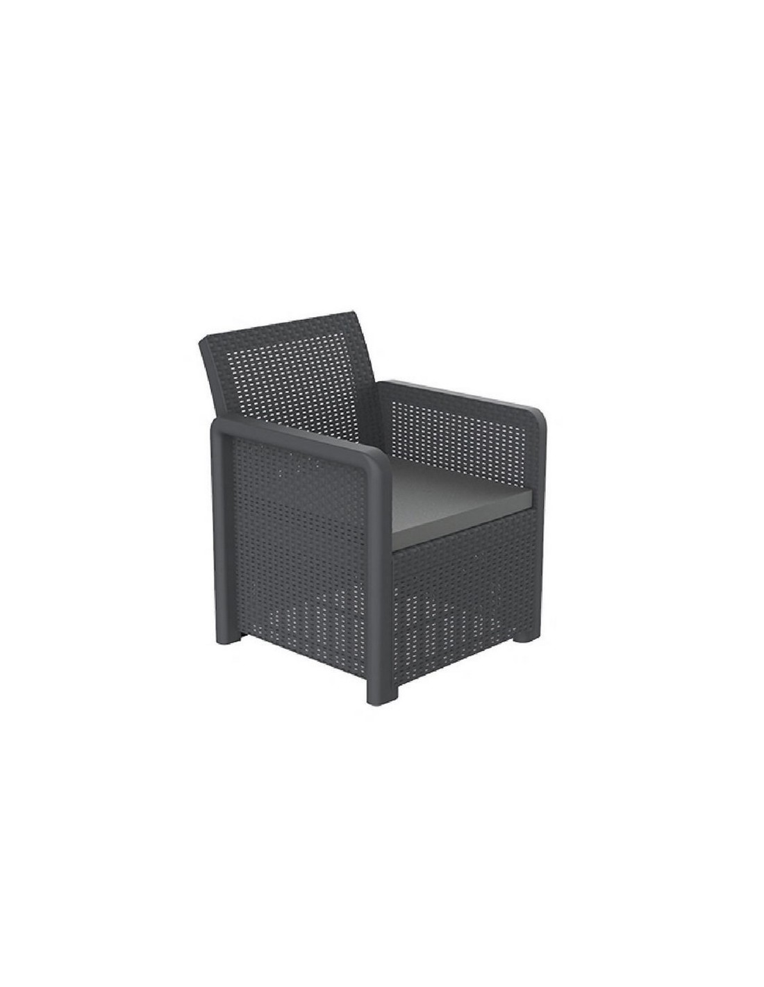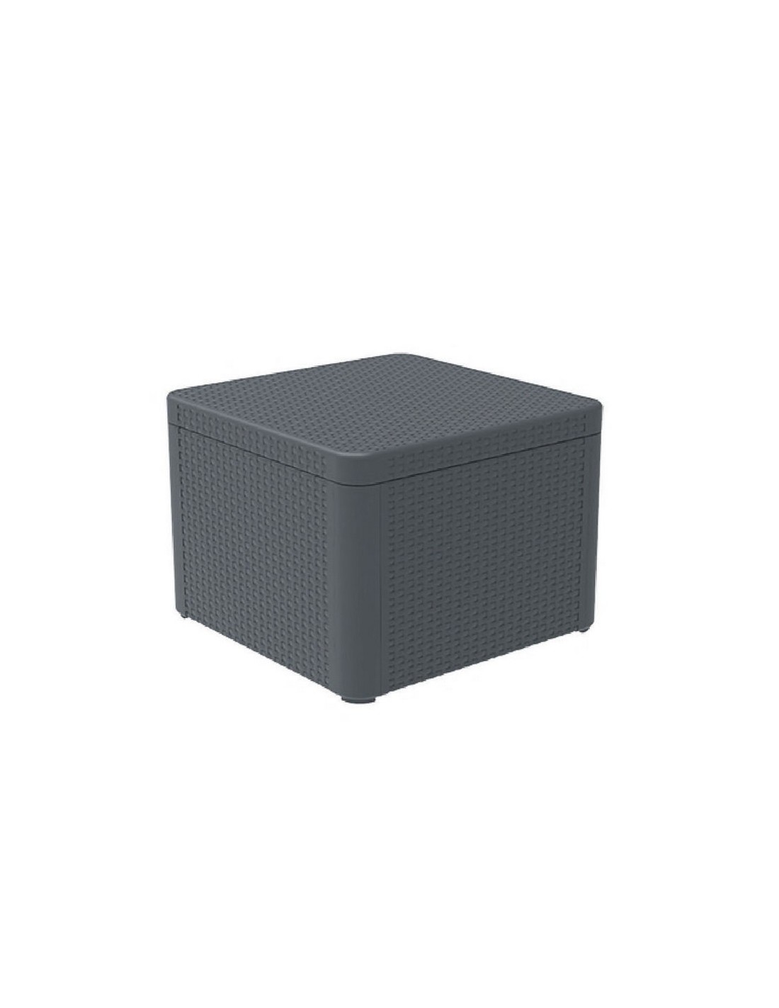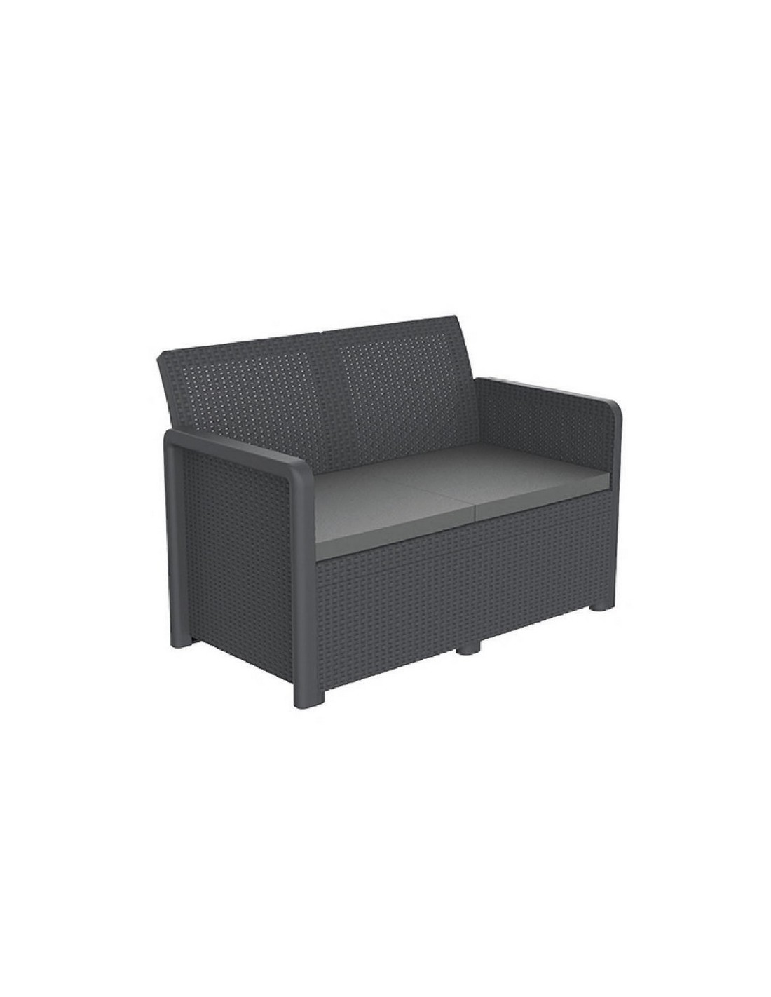 Conjunto NASSAU Storage Polipropileno color grafito. Capacidad de almacenaje en la mesa. Cojines en polialgodón color gris oscuro. Sofá 2 plazas: 109x60xh.74 cm.