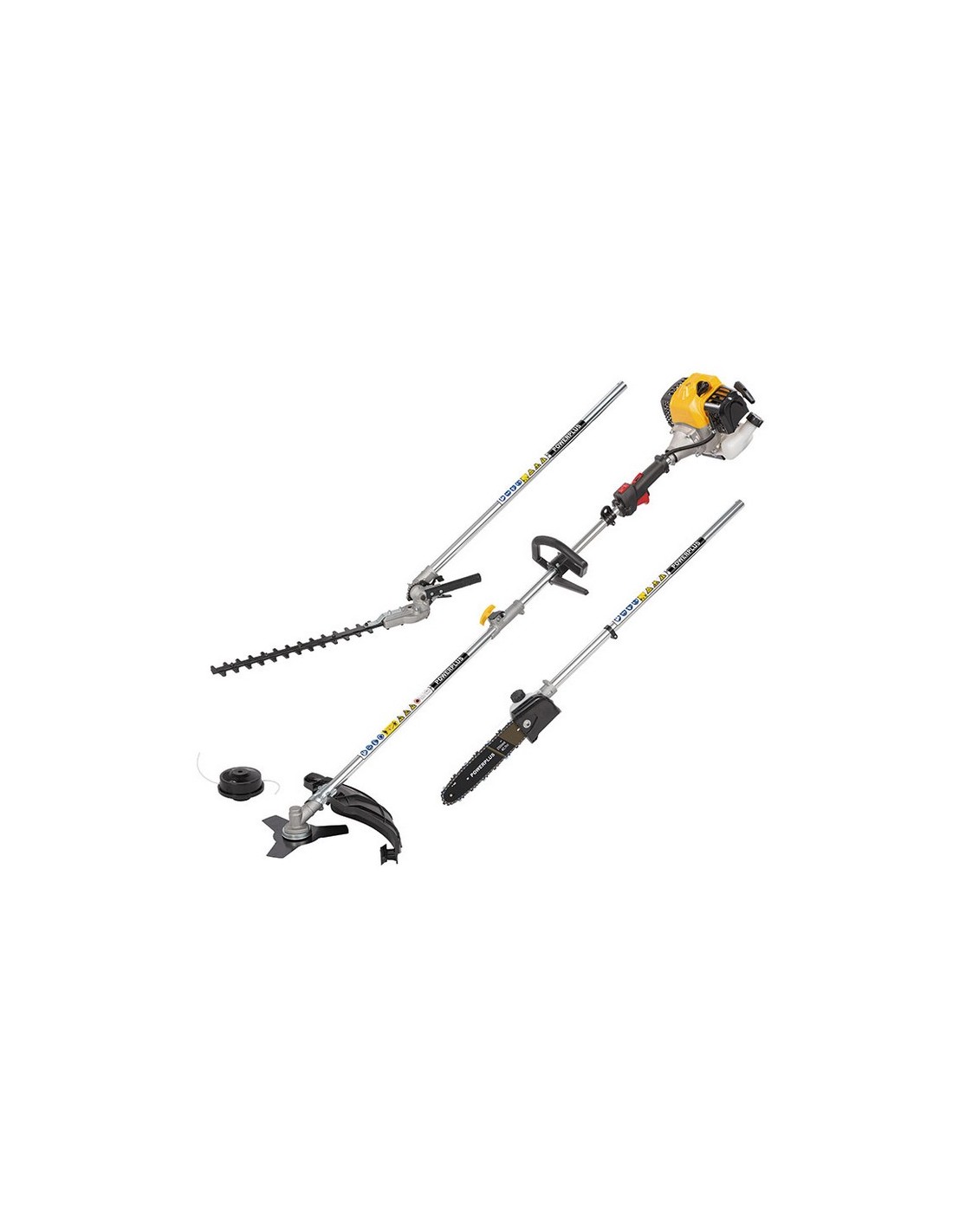 Multiherramienta 4 en 1 POWERPLUS Esta herramienta de jardín 4-en-1 puede encargarse de una larga variedad de trabajos en el jardín. Tiene un motor de fácil encendido de 42.7 cc, que hace funcionar 4 importantes herramientas de jardín: un recortasetos, una motosierra, una desbrozadora y un cortabordes. Con un extensión árbol de 905 mm esta versátil herramienta de jardín es también perfecta para cortar ramas altas o setos altos. El cabezal ajustable puede inclinarse al ángulo deseado y añade la flexibilidad necesaria. El potente motor combina un arranque fácil con una tecnología de baja vibración para una óptima seguridad y extra comodidad. Se incluye también un suave y cómodo arnés. Volumen del cilindro: 42,7 cc