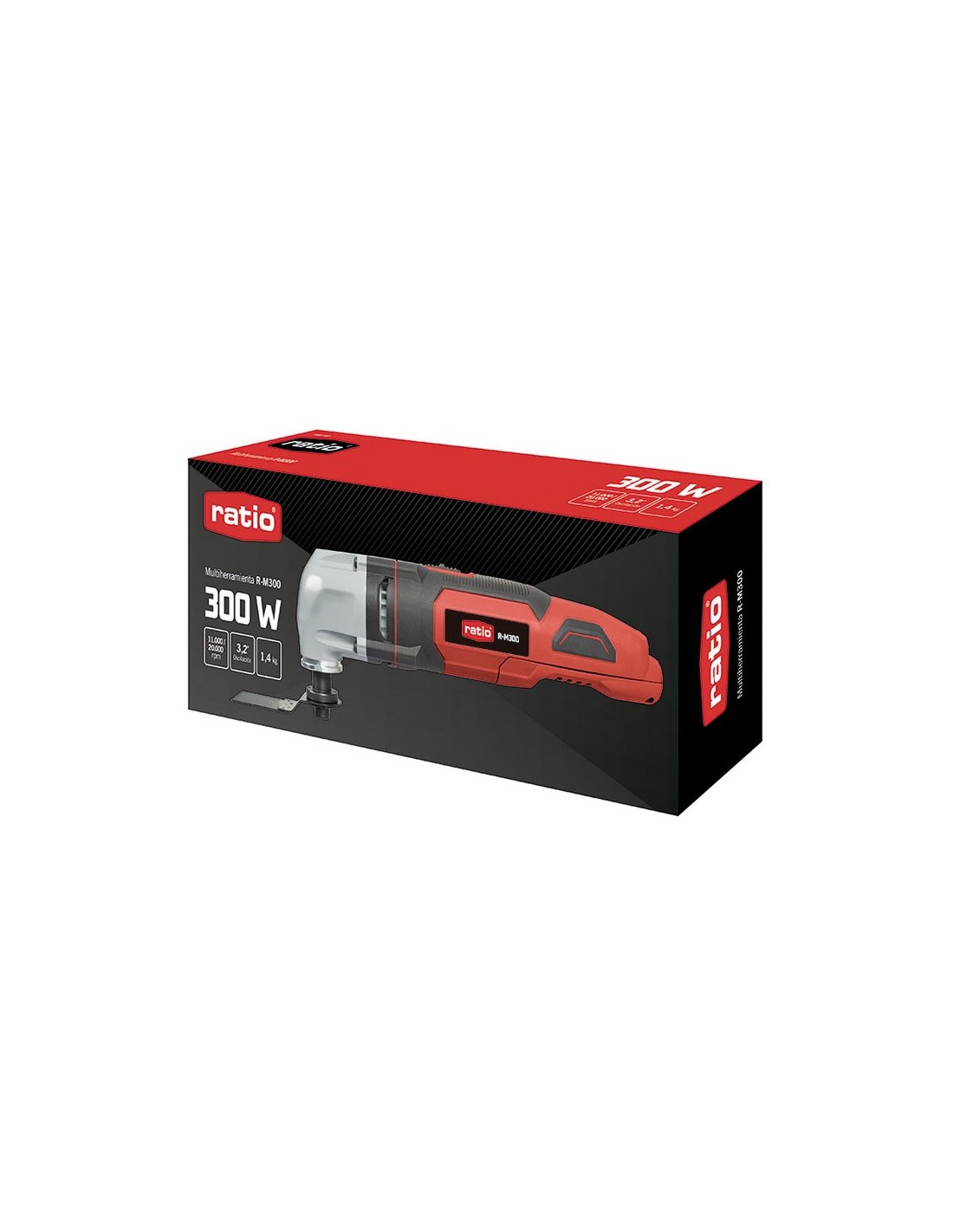 Multiherramienta eléctrica RATIO R-M300 Regulador eléctrónico de velocidad. Anclaje universal (Fein, Worx, Bosch, B&D). Sistema de extracción de polvo incorporado. Empuñadura bimaterial. Incluye accesorios. Potencia 300 W.