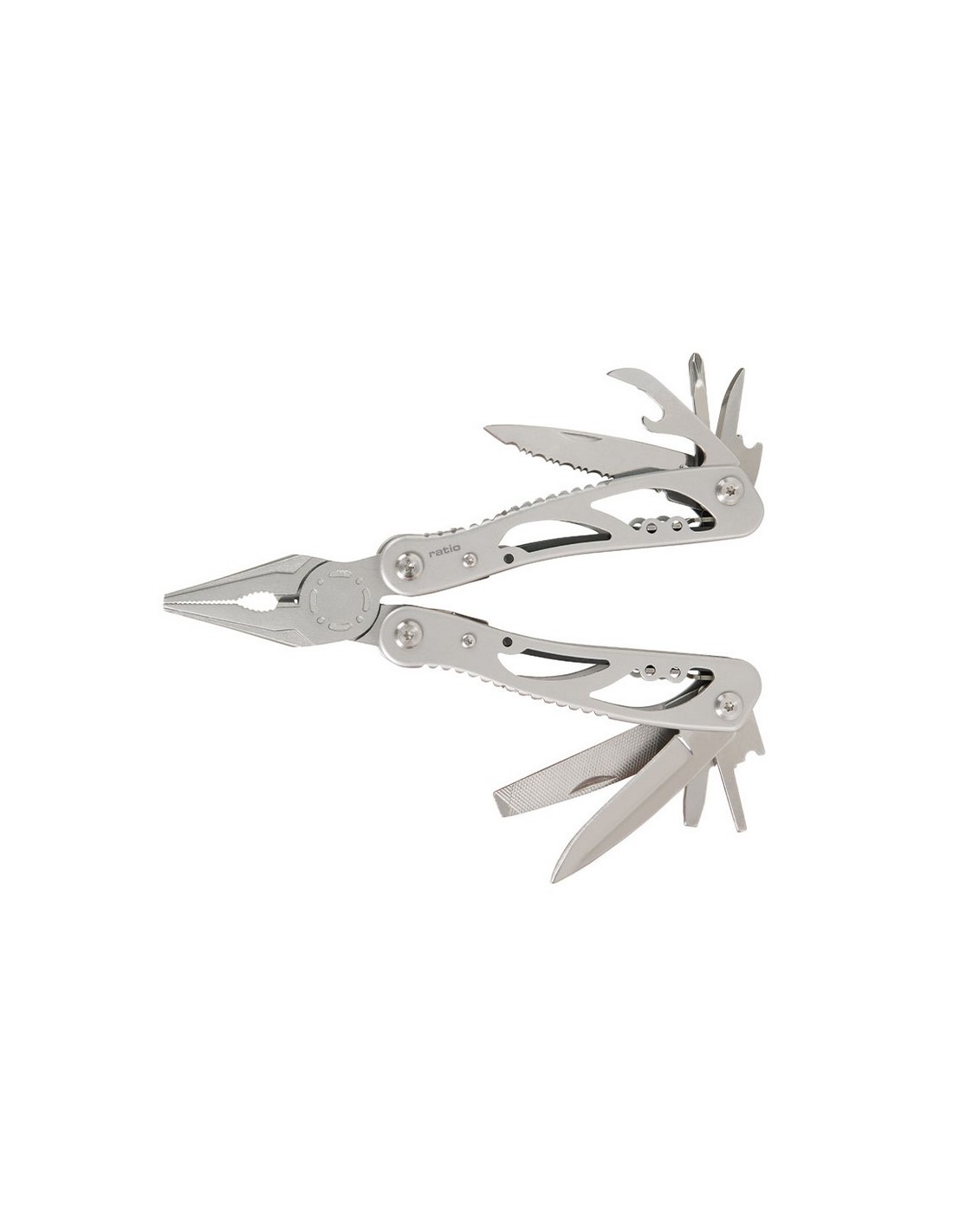 Alicate multiherramienta RATIO MultiTool Cuerpo de acero inox 420. Incluye funda de nilón adaptable a cinturón. 10 funciones. Medida abierto: 160 mm y cerrado: 105 mm. Composición: