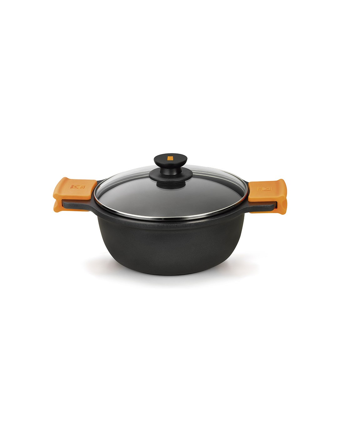 Sartenes y cacerolas BRA serie Efficient Aluminio fundido. 6 mm de espesor de base. Revestimiento tricapa antiadherente de Teflón Platinum Plus 100% libre PFOA. Cacerolas con tapa y asas de silicona termoresistentes y desmontables. Aptas para todo tipo de cocinas. Cacerola alta 24 cm.