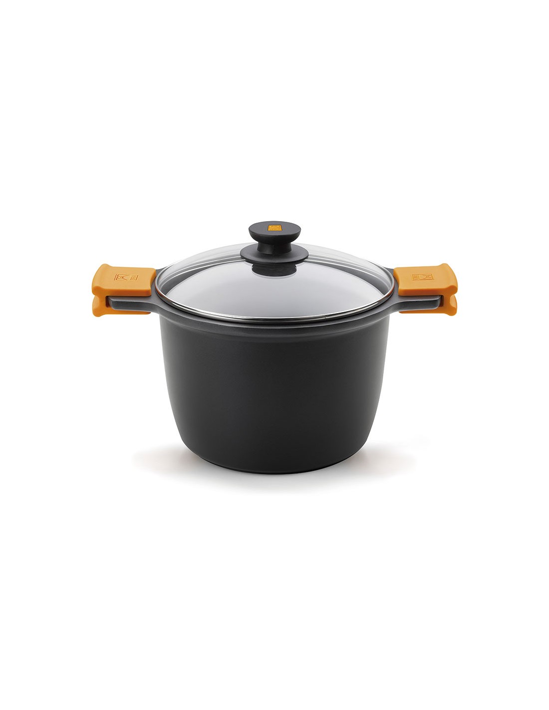 Sartenes y cacerolas BRA serie Efficient Aluminio fundido. 6 mm de espesor de base. Revestimiento tricapa antiadherente de Teflón Platinum Plus 100% libre PFOA. Cacerolas con tapa y asas de silicona termoresistentes y desmontables. Aptas para todo tipo de cocinas. Olla alta 24 cm.