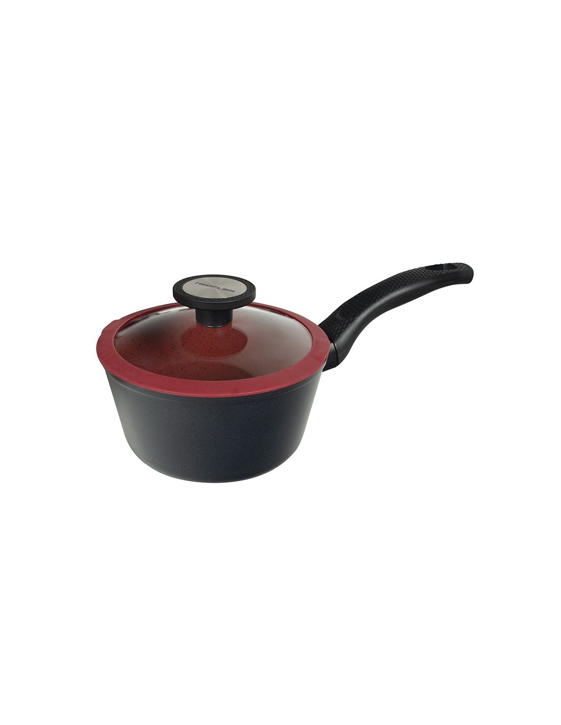 Sartenes y cacerolas NEOFLAM serie Chef Aluminio forjado. Interior y exterior con recubrimiento cerámico antiadherente Xtrema, libre PFOA. Sartenes con mangos ergonómicos de baquelita. Cacerolas con asas de baquelita antiquemaduras y tapa de cristal templado con bordes de silicona y verted Cazo. ø 18 cm.