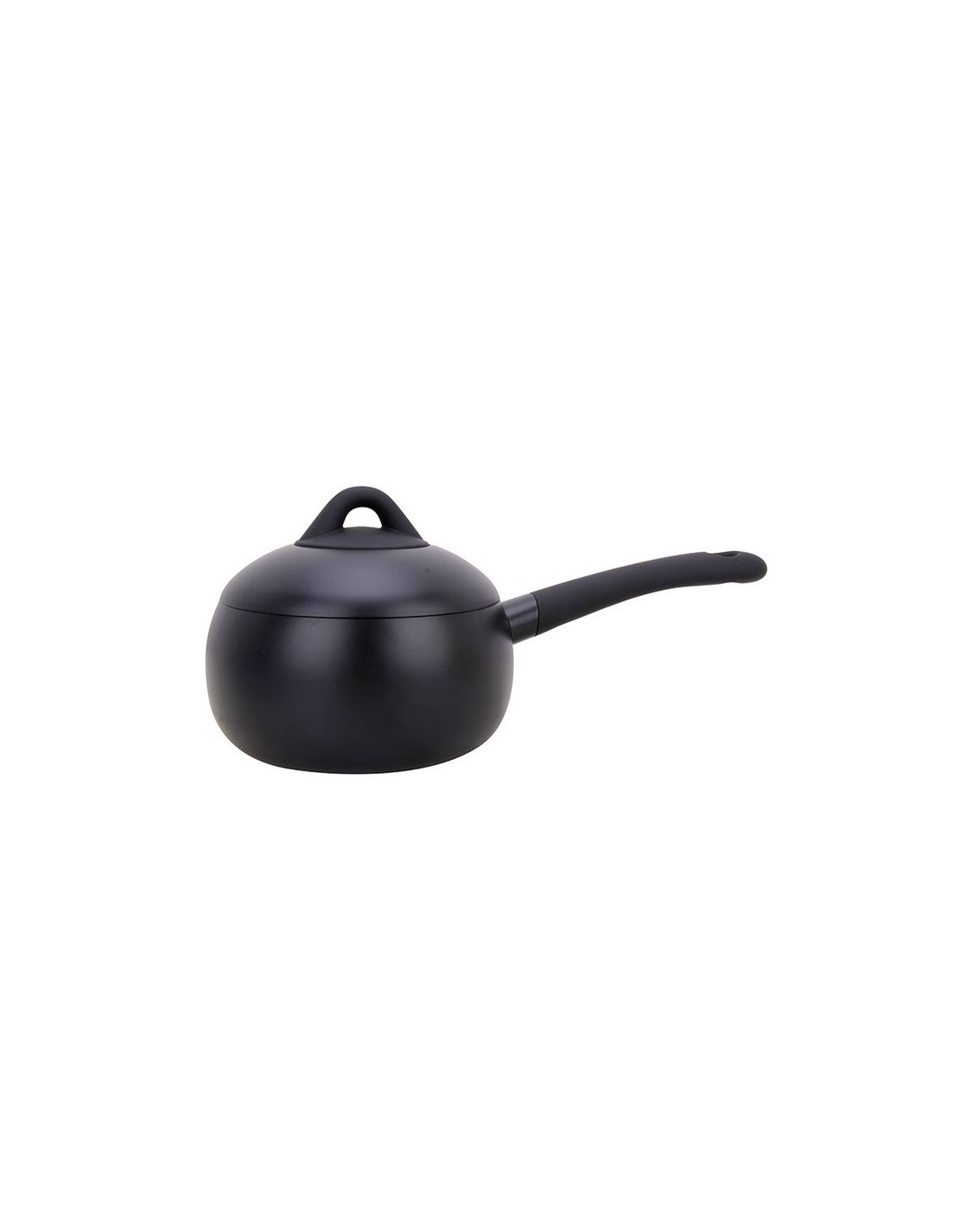 Sartenes y cacerolas AMERCOOK K-Line Black By Luca Trazzi. Aluminio prensado. Cuerpo 3 mm. espesor. Interior antiadherente 3 capas, libre PFOA. Fondo difusor con base ferrítica full induction para todo tipo de cocinas. Mangos y asas de baquelita acabado soft touch. Exterior lacado negro. Cazo con tapa ø 16 cm.