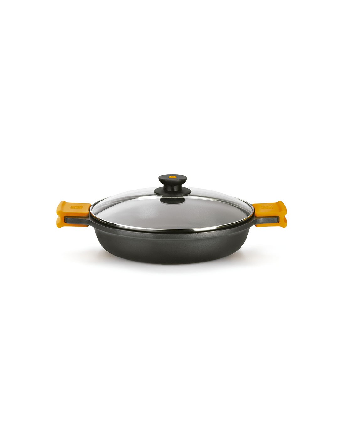 Sartenes y cacerolas BRA serie Efficient Aluminio fundido. 6 mm de espesor de base. Revestimiento tricapa antiadherente de Teflón Platinum Plus 100% libre PFOA. Cacerolas con tapa y asas de silicona termoresistentes y desmontables. Aptas para todo tipo de cocinas. Cacerola baja 28 cm.