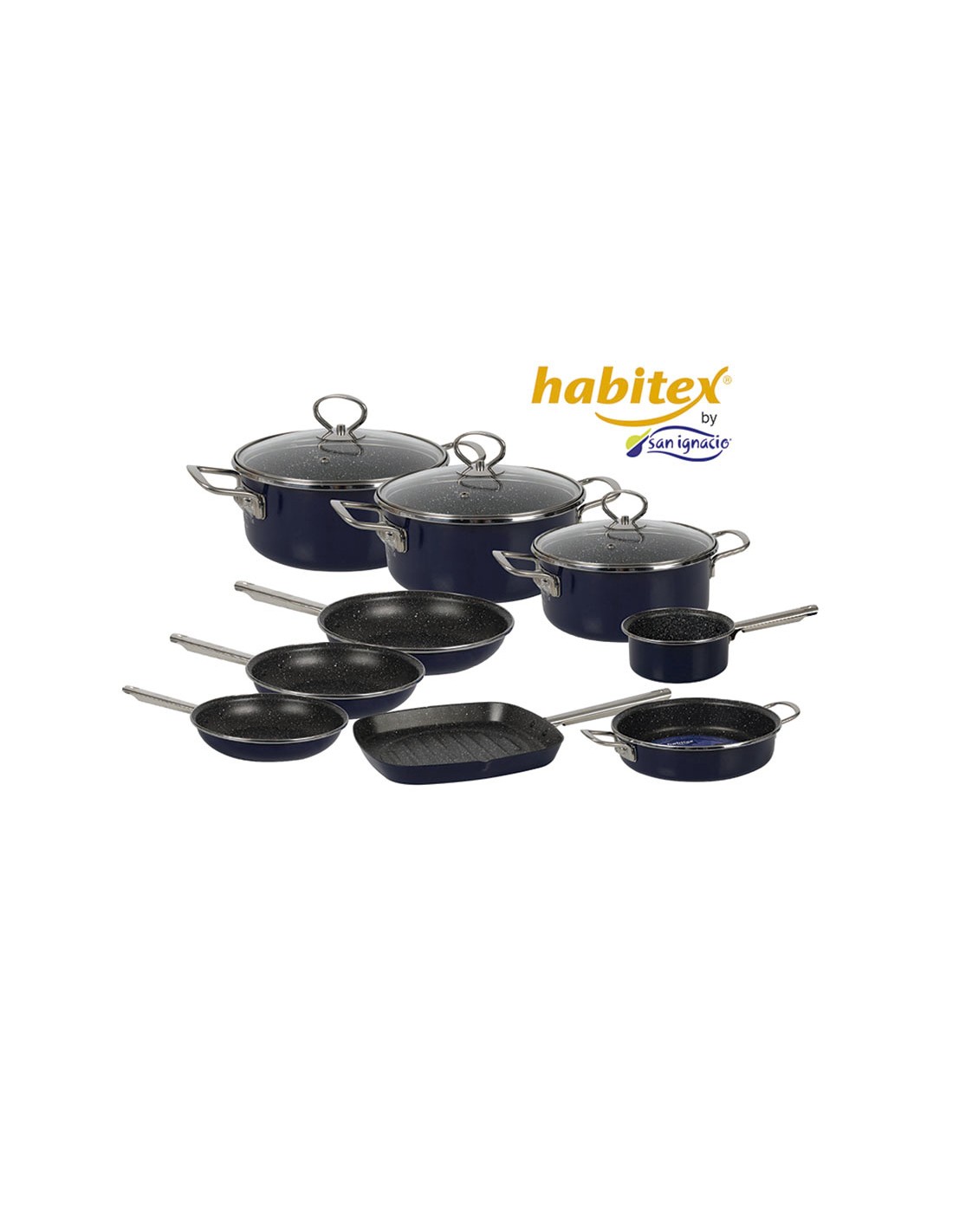 Sartenes y cacerolas HABITEX Oceania by SAN IGNACIO Acero esmaltado vitrificado con recubrimiento antiadherente piedra bicapa, libre PFOA. Mango y asas remachadas de acero inox. Tapadera de cristal con aro metálico. Para todo tipo de cocinas. Apto para lavavajillas. Cacerola ø 20 cm.