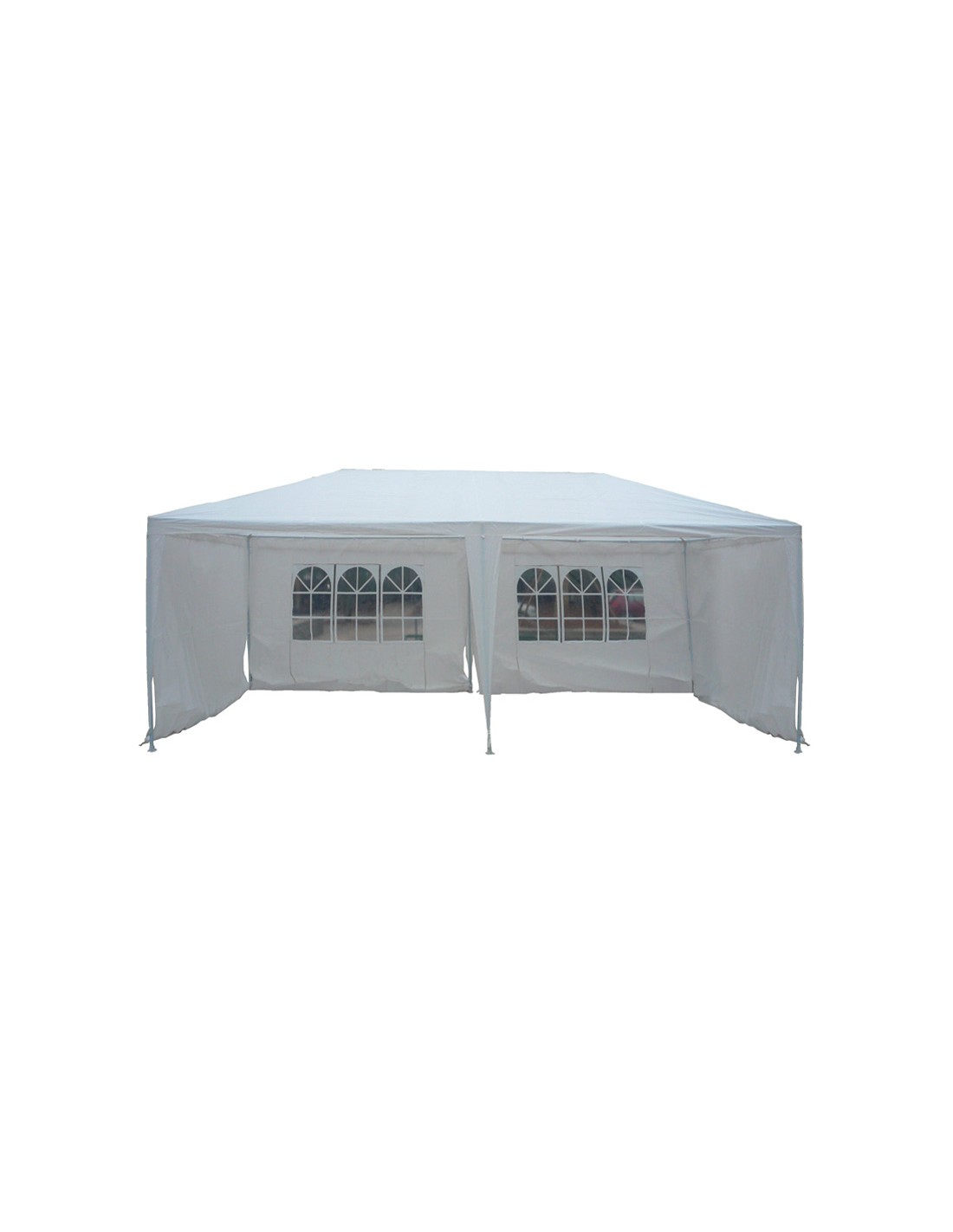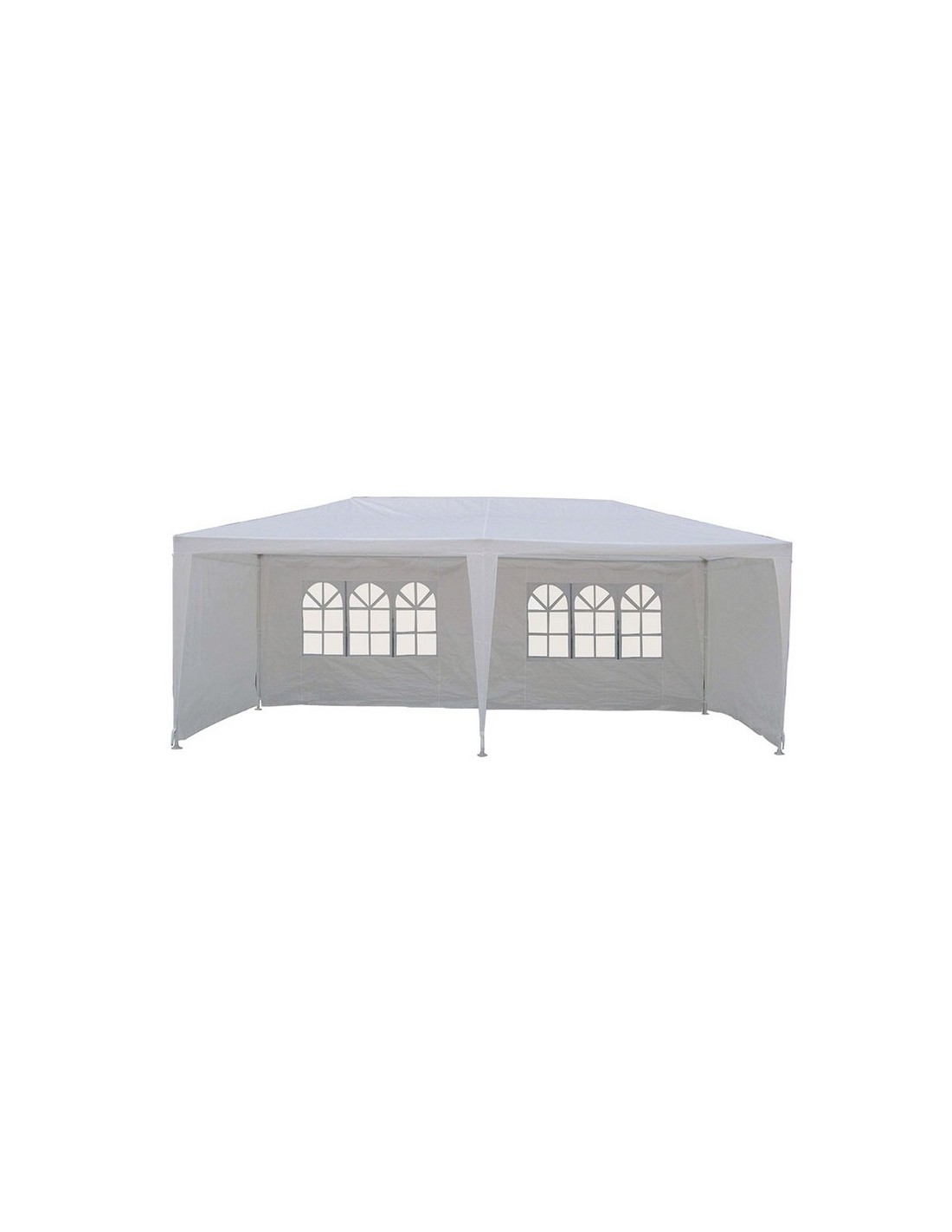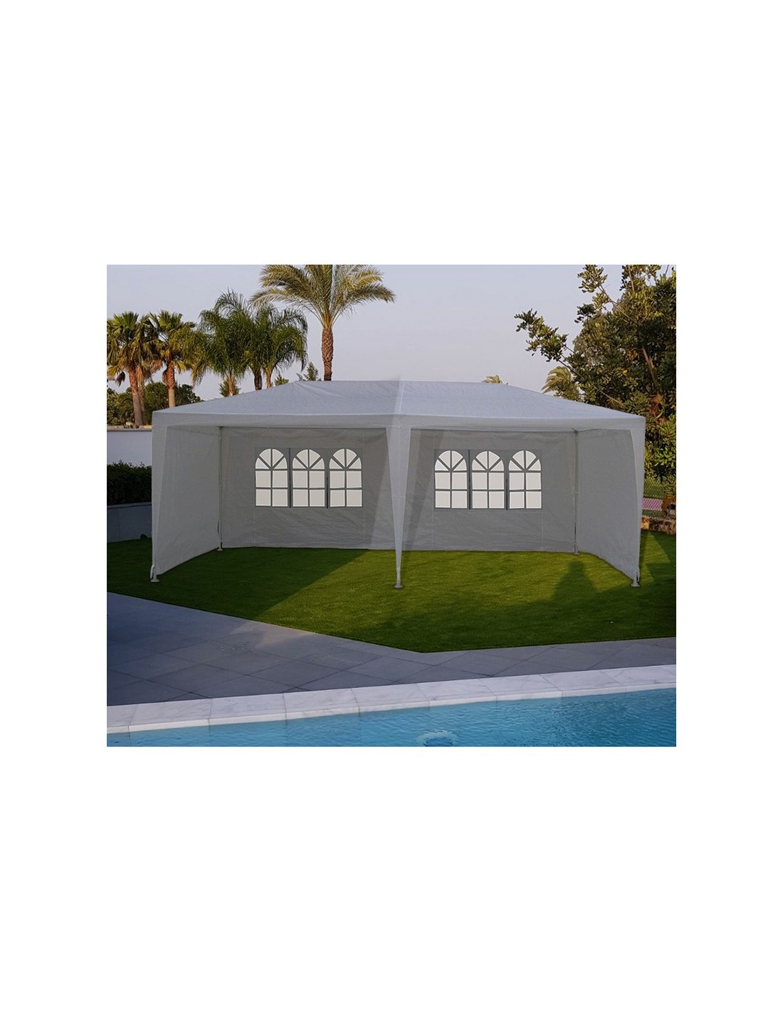 Pérgola de jardín 6x3xh. 2,70 m. Estructura metálica. Toldo de rafia blanca. Cerramiento por los 3 lados con cortinas laterales.